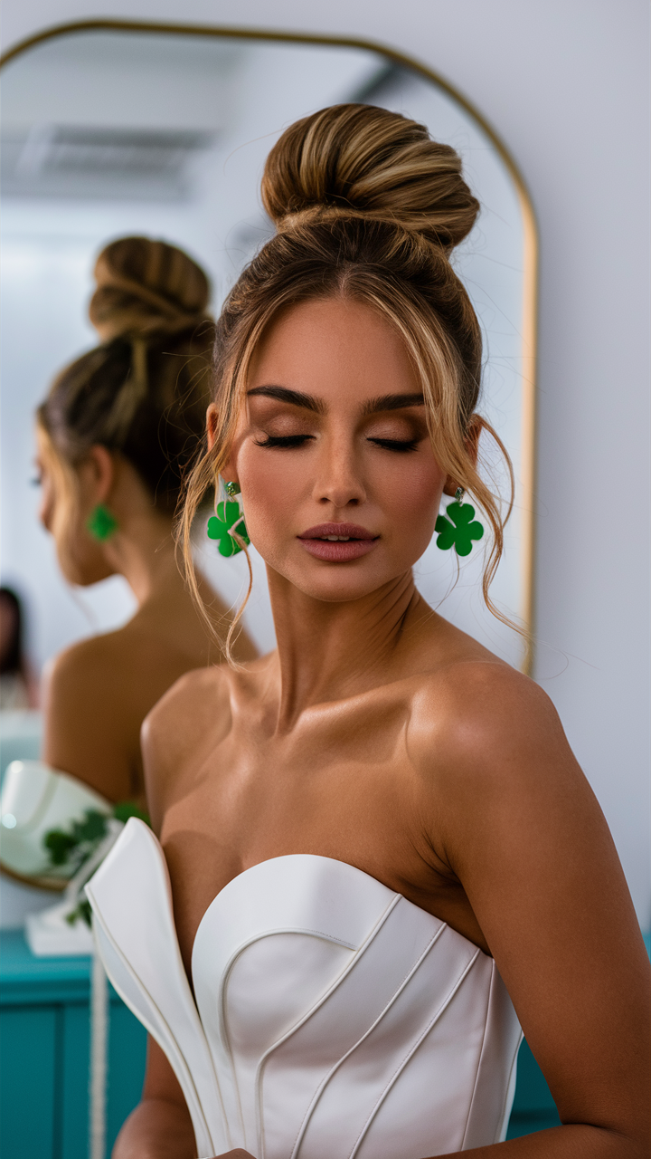 This sleek high bun pairs beautifully with light brown hair colors no highlights, showcasing its solid and polished appearance. The softly curled face-framing strands add a delicate touch, making it ideal for formal or bridal styles. Its simplicity enhances the natural beauty of straight or slightly wavy textures.