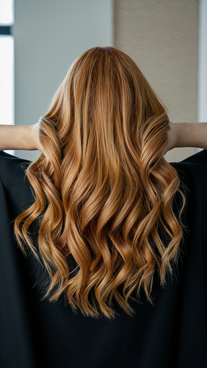 These long, cascading waves showcase light brown hair colors with red undertones, blending auburn and caramel hues. The soft waves add texture and movement, making this a flattering choice for curly hair. Its vibrant, warm finish is ideal for adding dimension during cooler seasons.