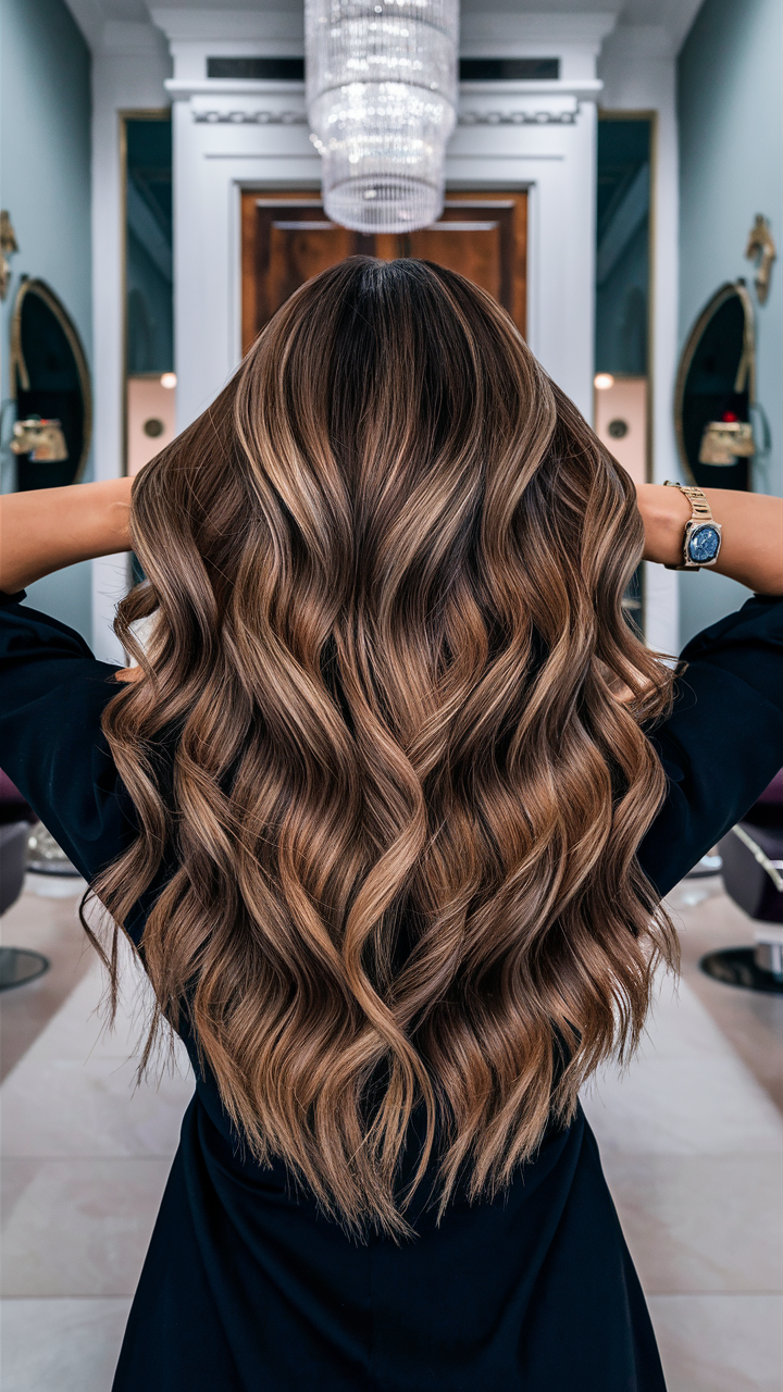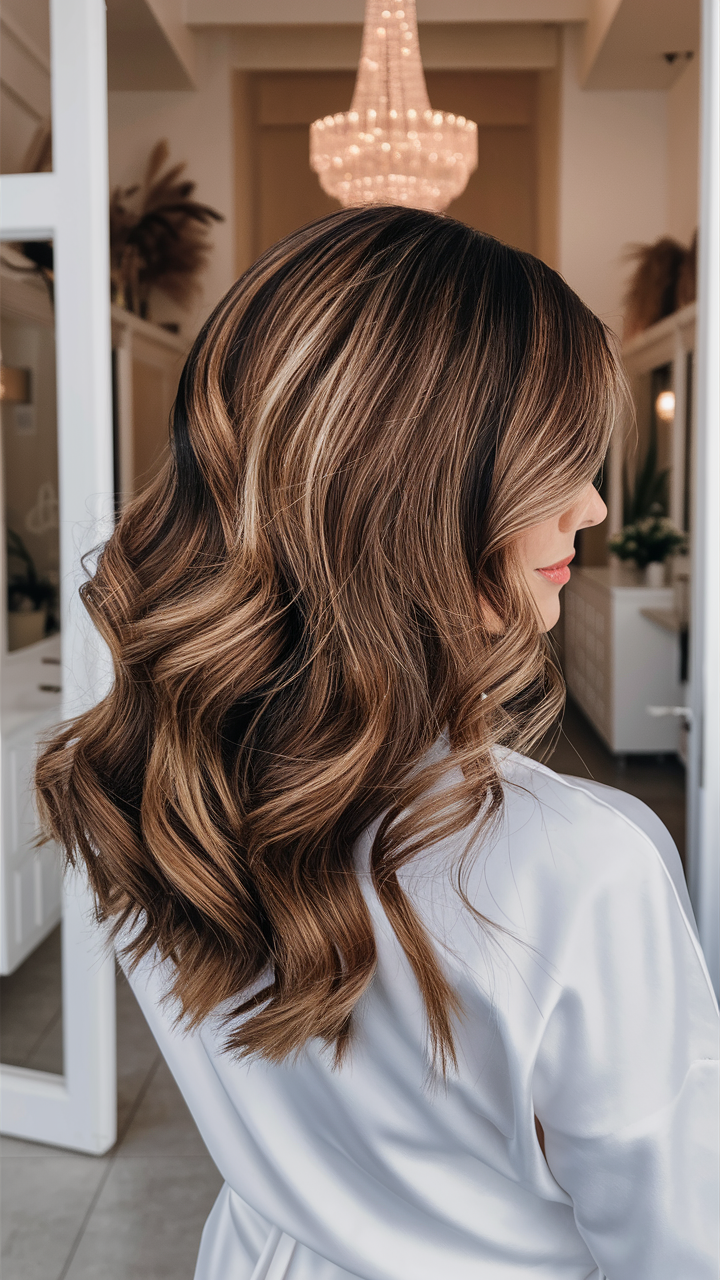 These rich caramel tones are paired with voluminous waves, creating a luxurious effect. The multi-dimensional highlights and lowlights add movement and depth to the look. The precision-cut layers frame the face beautifully, offering an elegant yet approachable style.