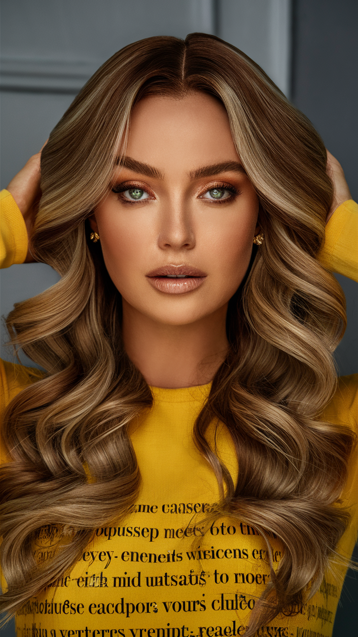 This long and voluminous light brown hairstyle features auburn tones that create a radiant and rich palette. The blended highlights frame the face beautifully, giving a glowing and youthful vibe. Ideal for those who love dimension and warmth in their hair color, this look is both vibrant and sophisticated.