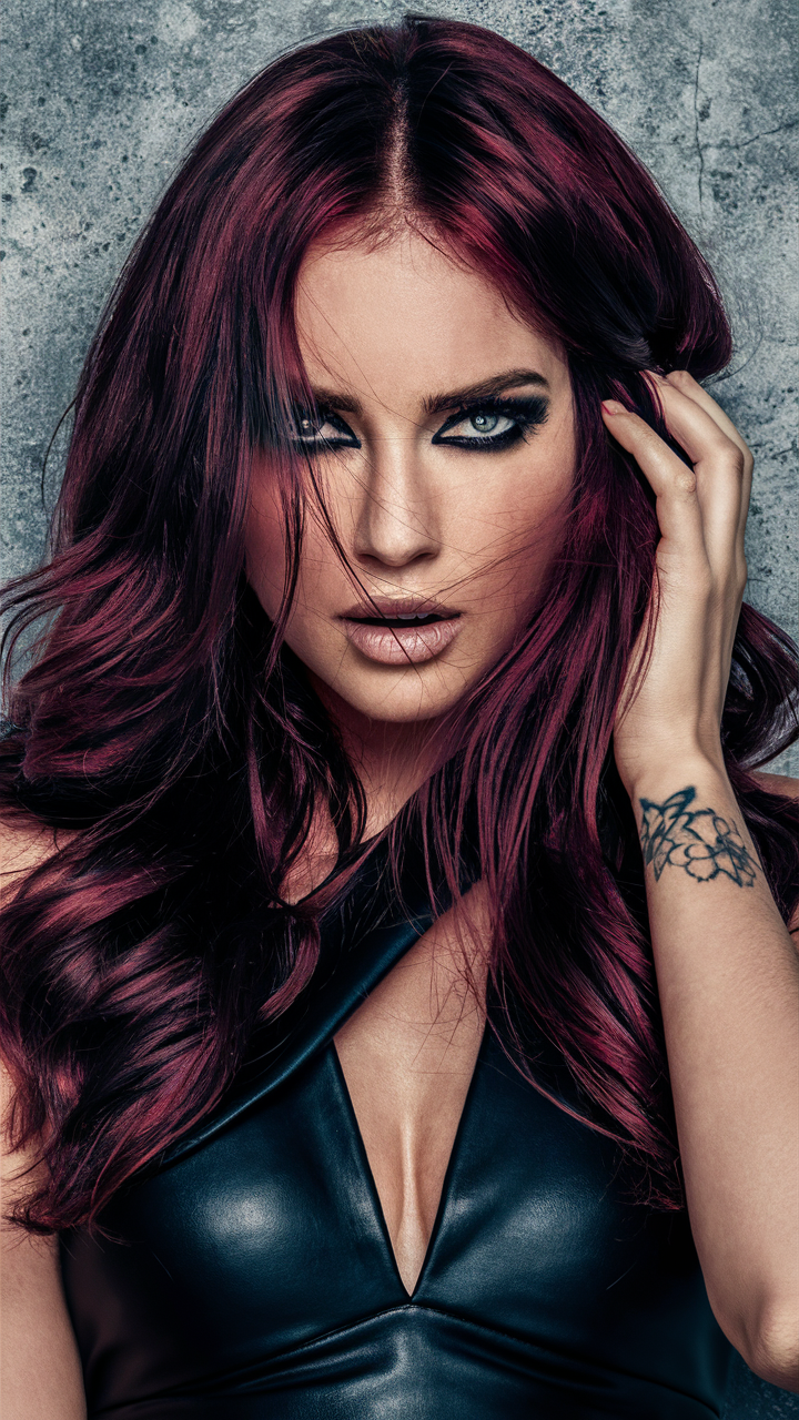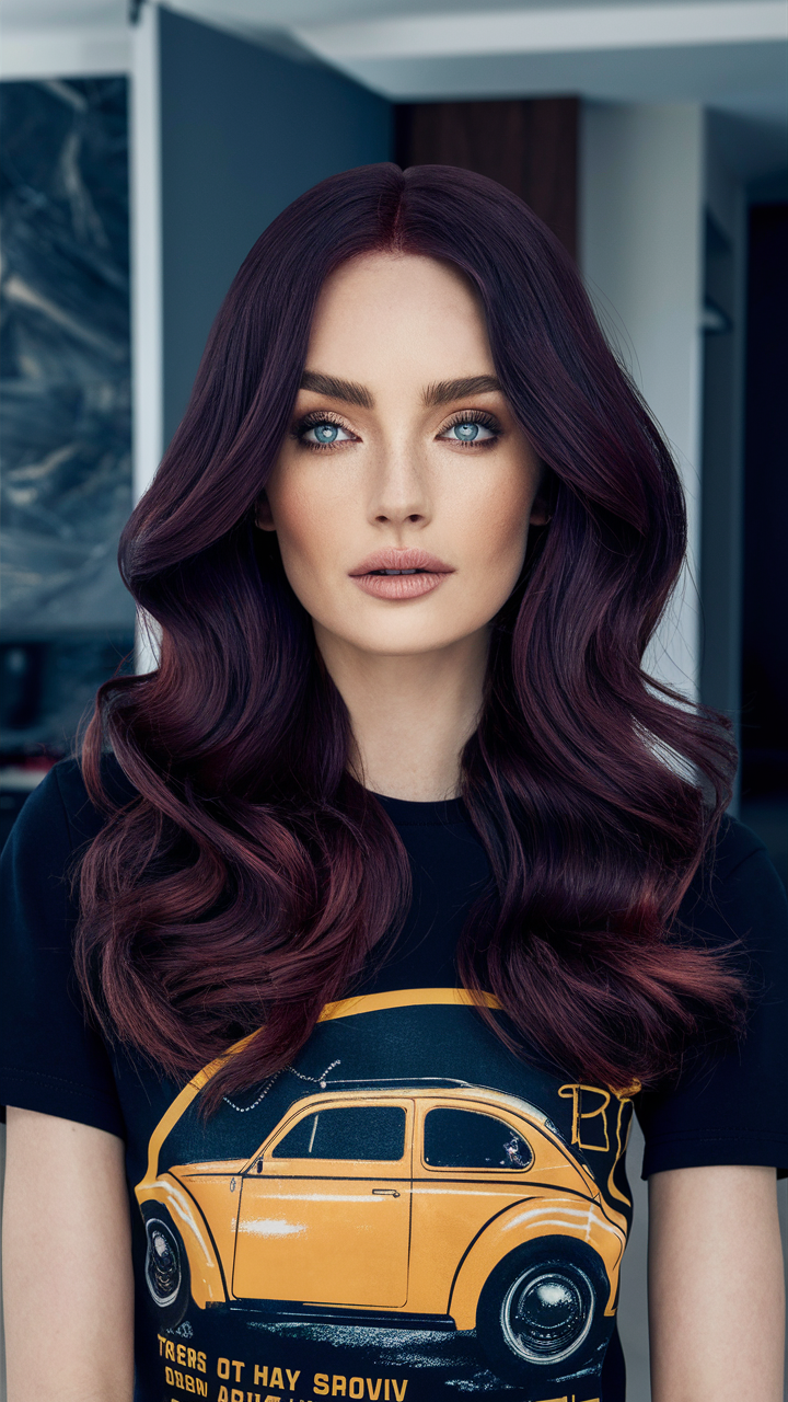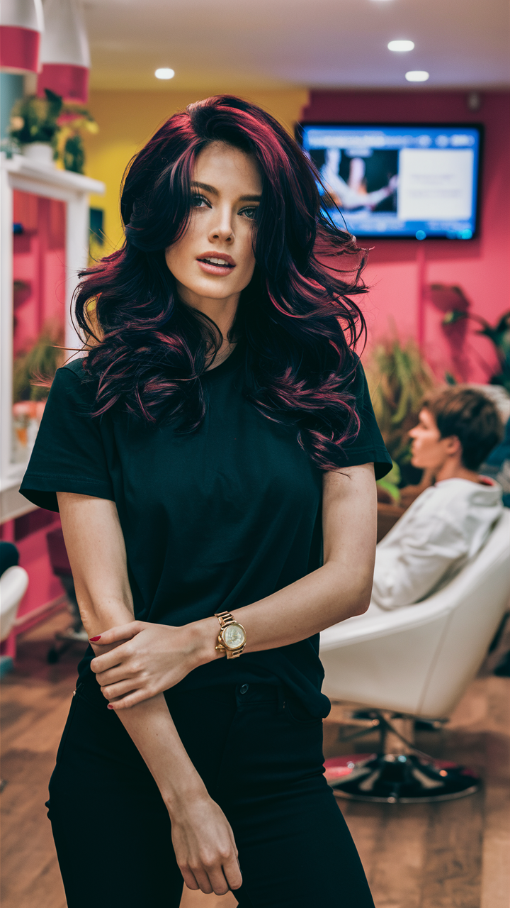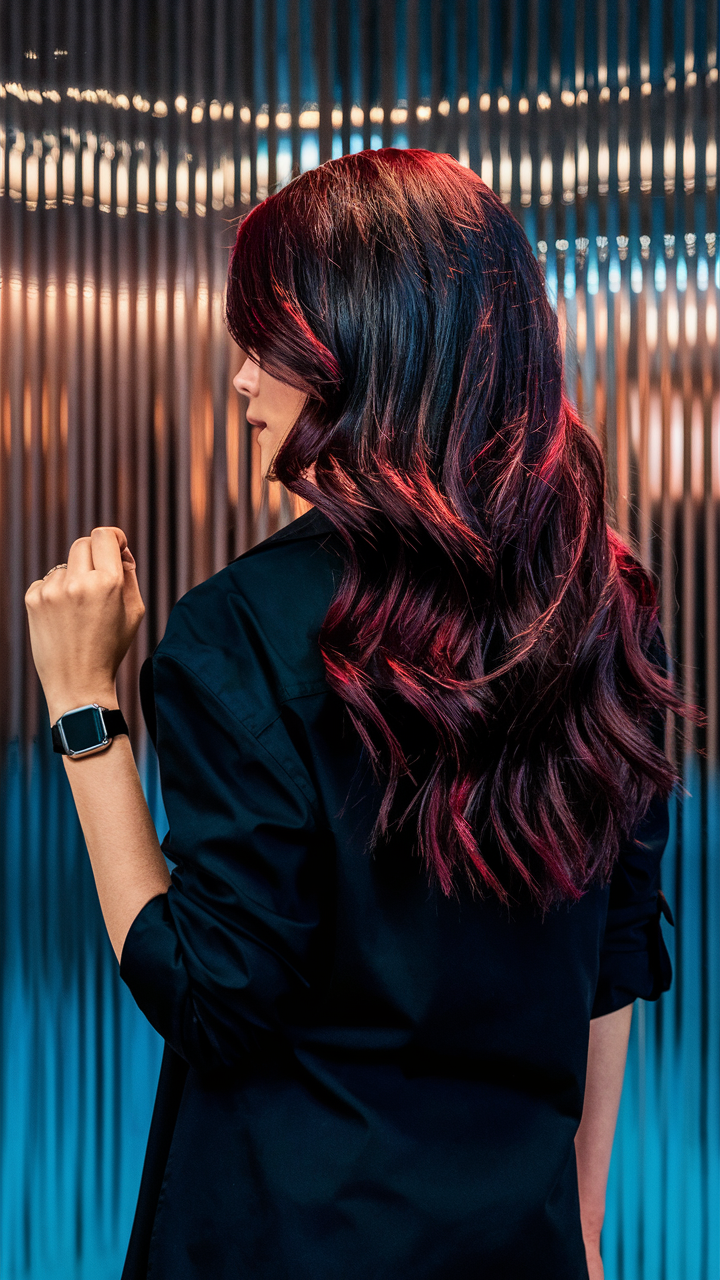Wavy burgundy hair with soft highlights adds depth and movement. This natural yet vibrant look is perfect for anyone embracing a fresh yet subtle change in their style.