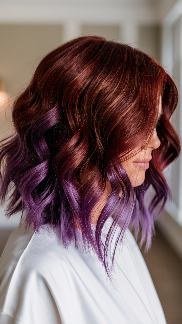 A wavy bob transitions from rich burgundy to vibrant purple, creating a playful twist on the classic bob. This style is perfect for experimenting with vibrant, eye-catching colors.