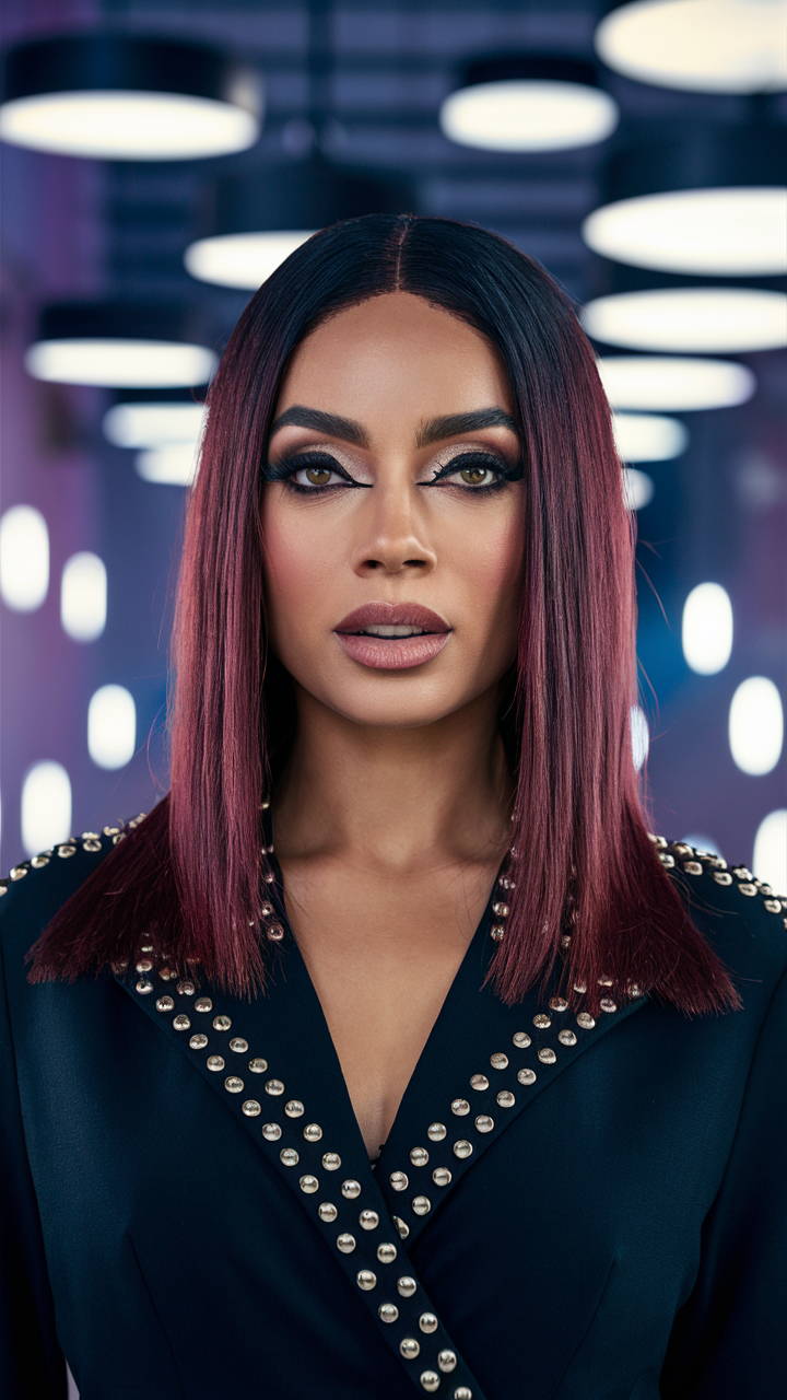 This sleek lob in dark burgundy tones offers a sharp, professional look. The smooth strands highlight the rich red hues, making it a polished choice for a modern aesthetic.