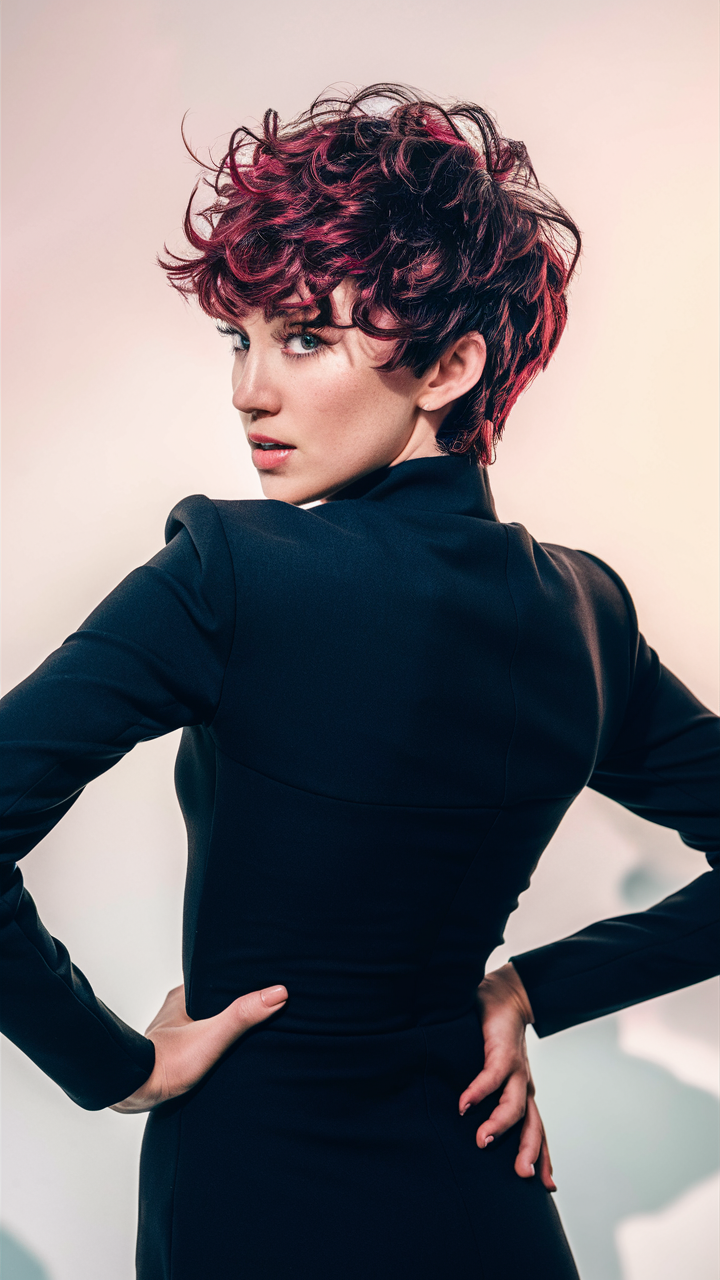 A bold pixie cut in deep burgundy tones features textured, tousled layers for volume. This edgy style is perfect for those seeking a daring and low-maintenance transformation.