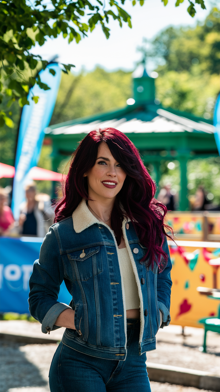 Voluminous dark burgundy waves accented by warm blonde highlights frame the face beautifully. This striking contrast adds brightness, making it perfect for a bold yet balanced appearance.