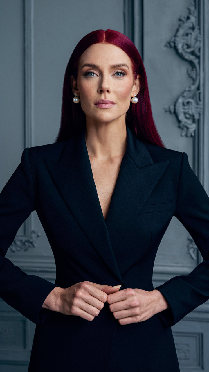 This sleek, straight look showcases a deep red shade with a polished center part. Perfect for simplicity with impact, this classic style enhances the sophistication of the rich tones.
