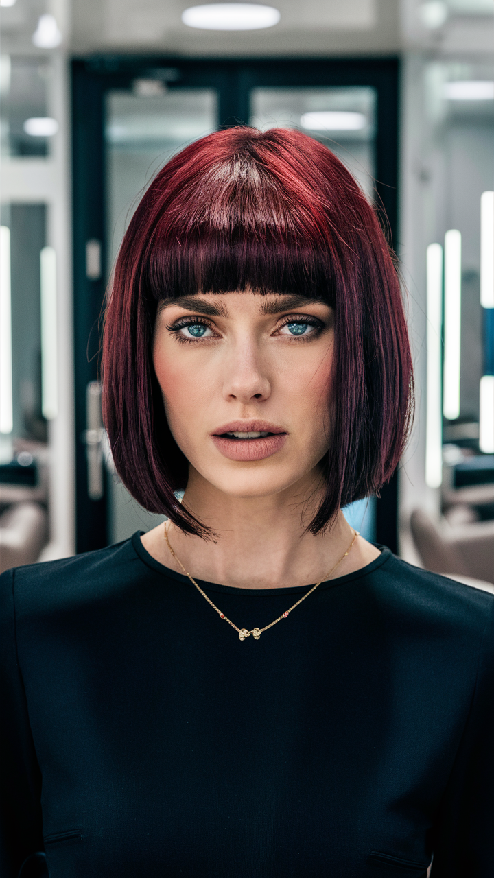 A short bob in rich burgundy hues paired with a straight-cut fringe creates a striking, modern aesthetic. The clean lines emphasize the boldness of the color, perfect for a chic, contemporary look.