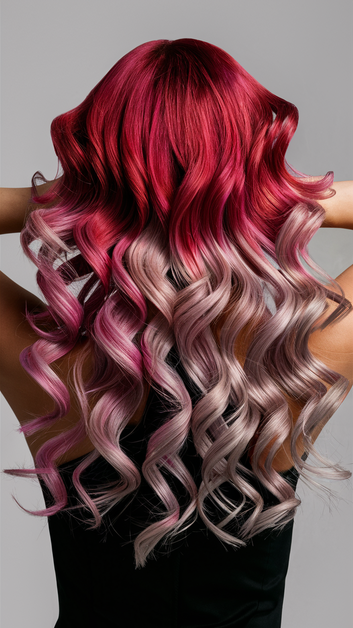 This ombré style transitions from vibrant magenta to lavender hues, with bouncy curls adding movement. Perfect for a playful, bold statement, this look highlights creative hair color artistry.