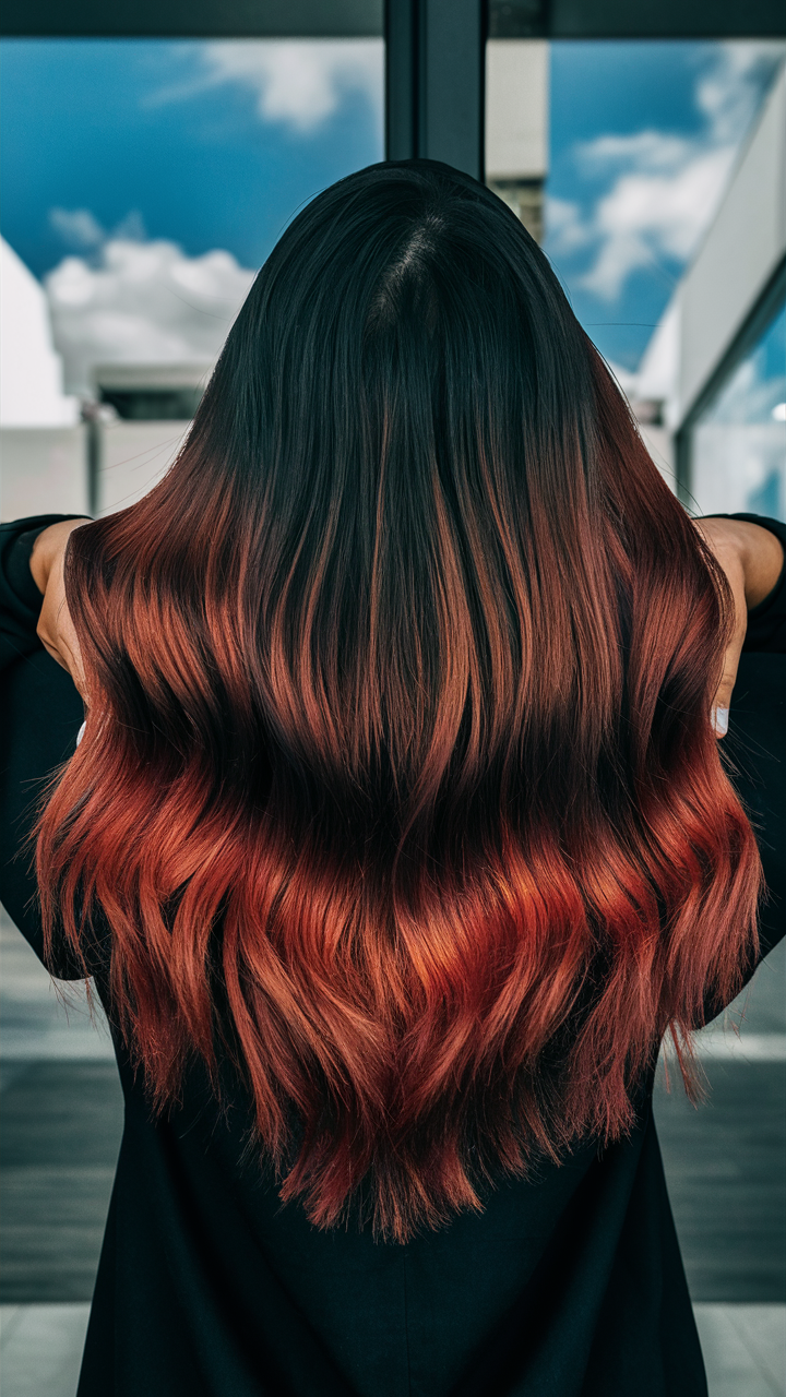 Smooth black roots melt into fiery red waves, creating a striking ombré effect. The natural texture adds vibrancy and motion, perfect for bold elegance.