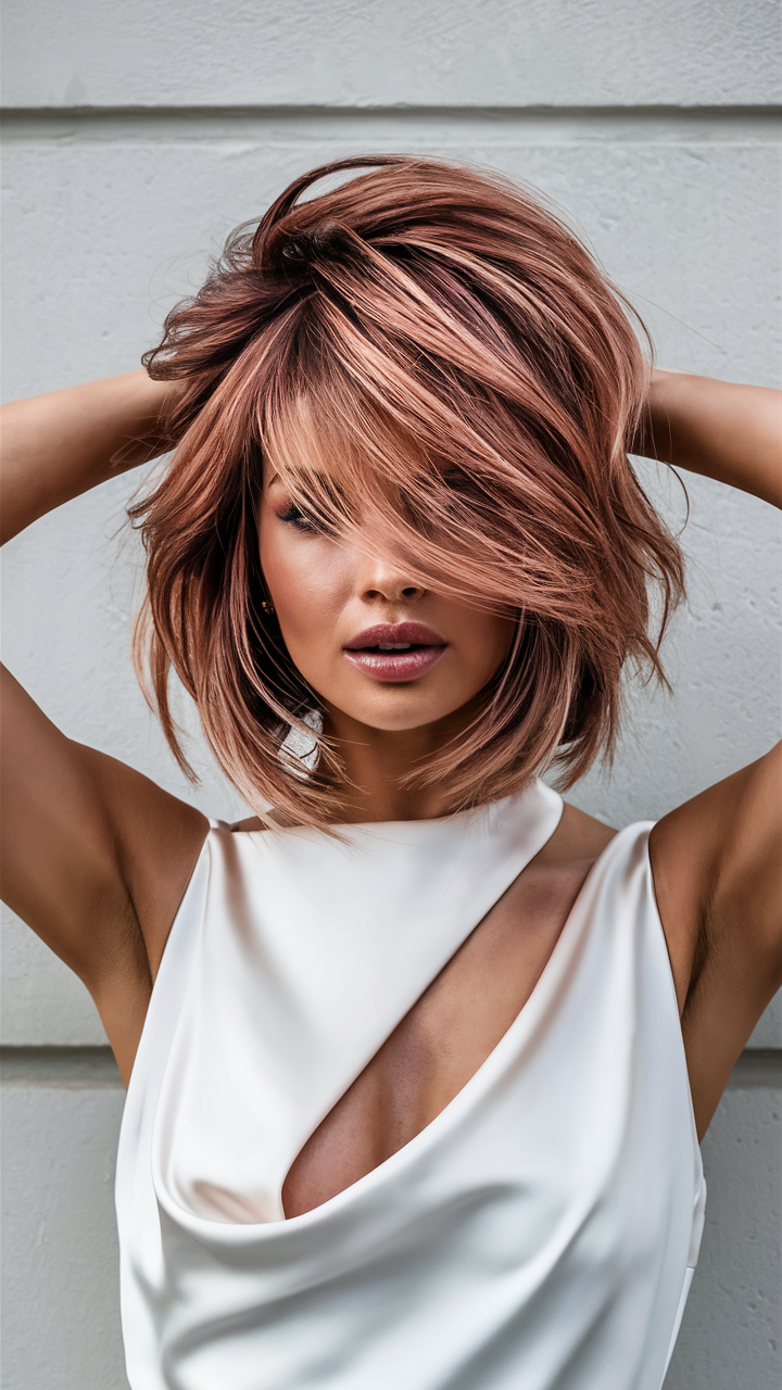 This chic bob features the rich warmth of Cowboy copper hair color 2025, enhanced with soft highlights for added dimension. The layered cut creates texture and movement, making it perfect for women with tan skin or brown skin. The subtle money piece frames the face beautifully, highlighting natural features.