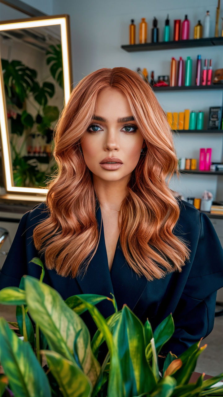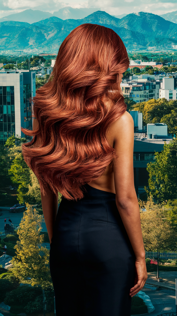 The soft waves bring out the multi-dimensional tones of Cowboy copper hair color 2025, blending darker roots with radiant copper lengths. This style pairs perfectly with blue eyes, adding a vibrant yet natural glow. Achieved with a formula like Wella, it’s a timeless option for long hair.