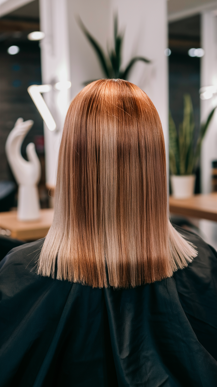 This sleek style highlights a seamless transition from dark brunette roots to luminous Cowboy copper hair color 2025. The straight cut showcases the bold block melt effect, ideal for brown eyes and a polished look. Enhance the color at home using Sally’s Beauty products for touch-ups.