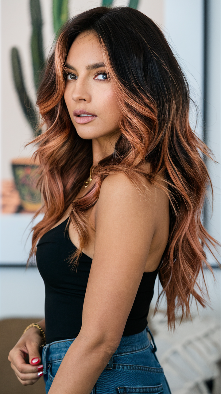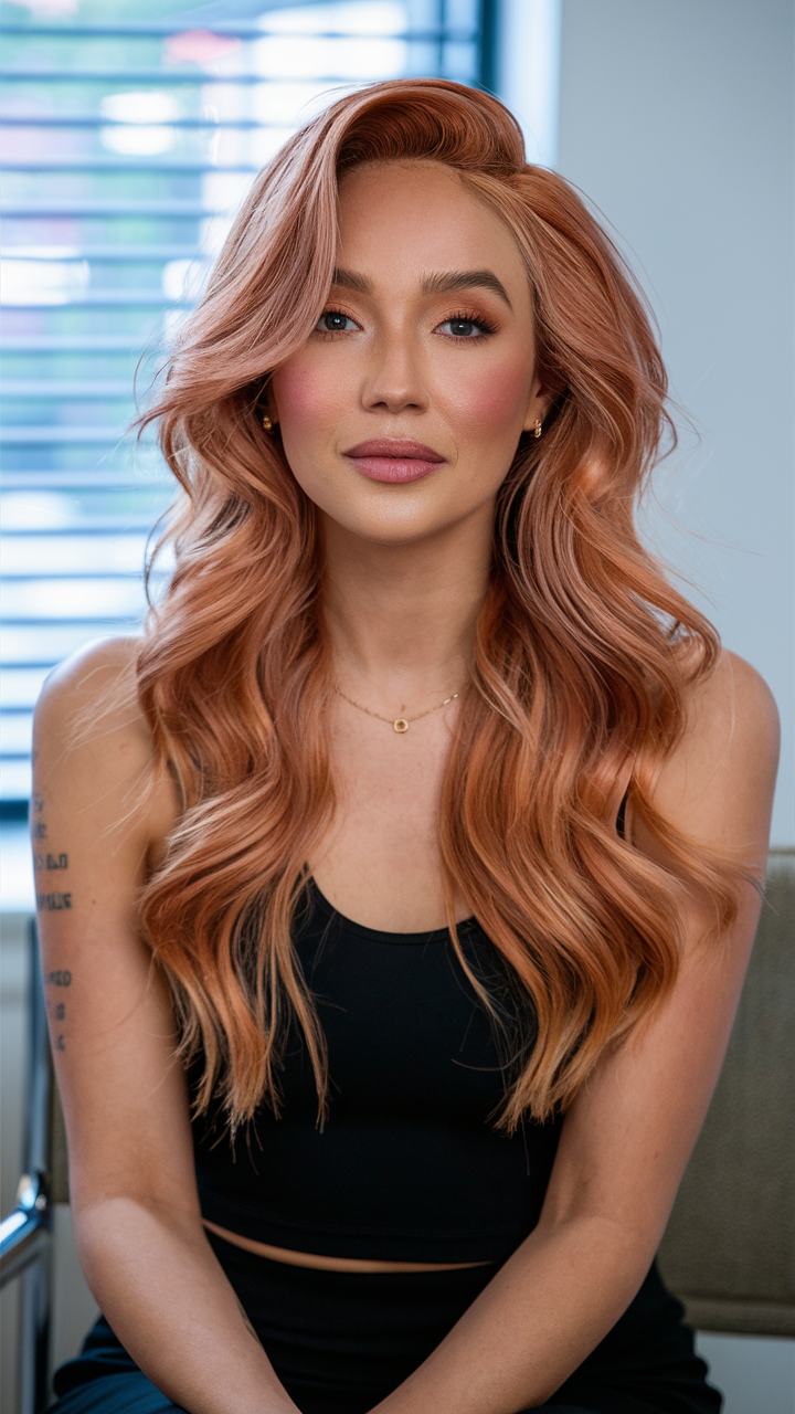 This look features dark roots transitioning into vibrant Cowboy copper hair color 2025, highlighted by a bold money piece. The soft waves add movement and volume, making it perfect for women with tan skin. This style enhances facial features and works beautifully for both casual and formal settings.