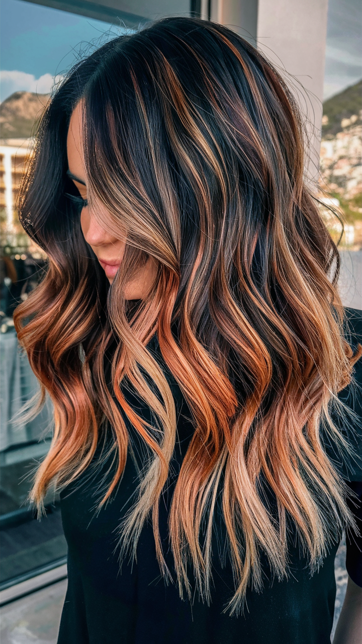 This long wavy hairstyle blends dark brunette roots with seamless Cowboy copper balayage highlights, adding a natural sun-kissed effect. The multidimensional tones enhance movement, making it ideal for brown-eyed women. It’s a versatile style that works beautifully for both casual and formal occasions.