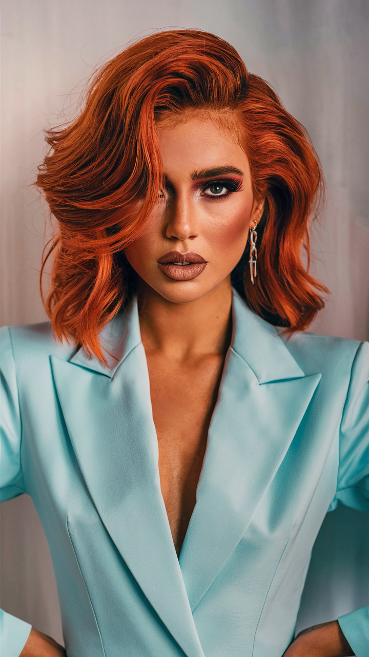 This side-swept bob features fiery Cowboy copper hair color 2025, making it a show-stopping choice for bold personalities. The voluminous waves create a striking silhouette, perfect for tan skin or a glamorous event. It’s a sophisticated look that radiates confidence.
