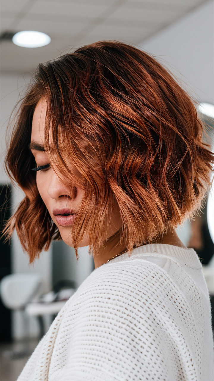 This short textured bob flaunts the vibrancy of Cowboy copper hair color 2025, with its radiant, rich tones. The tousled waves add effortless volume, making it ideal for a casual yet chic look. Perfect for women seeking a versatile, easy-to-style haircut.