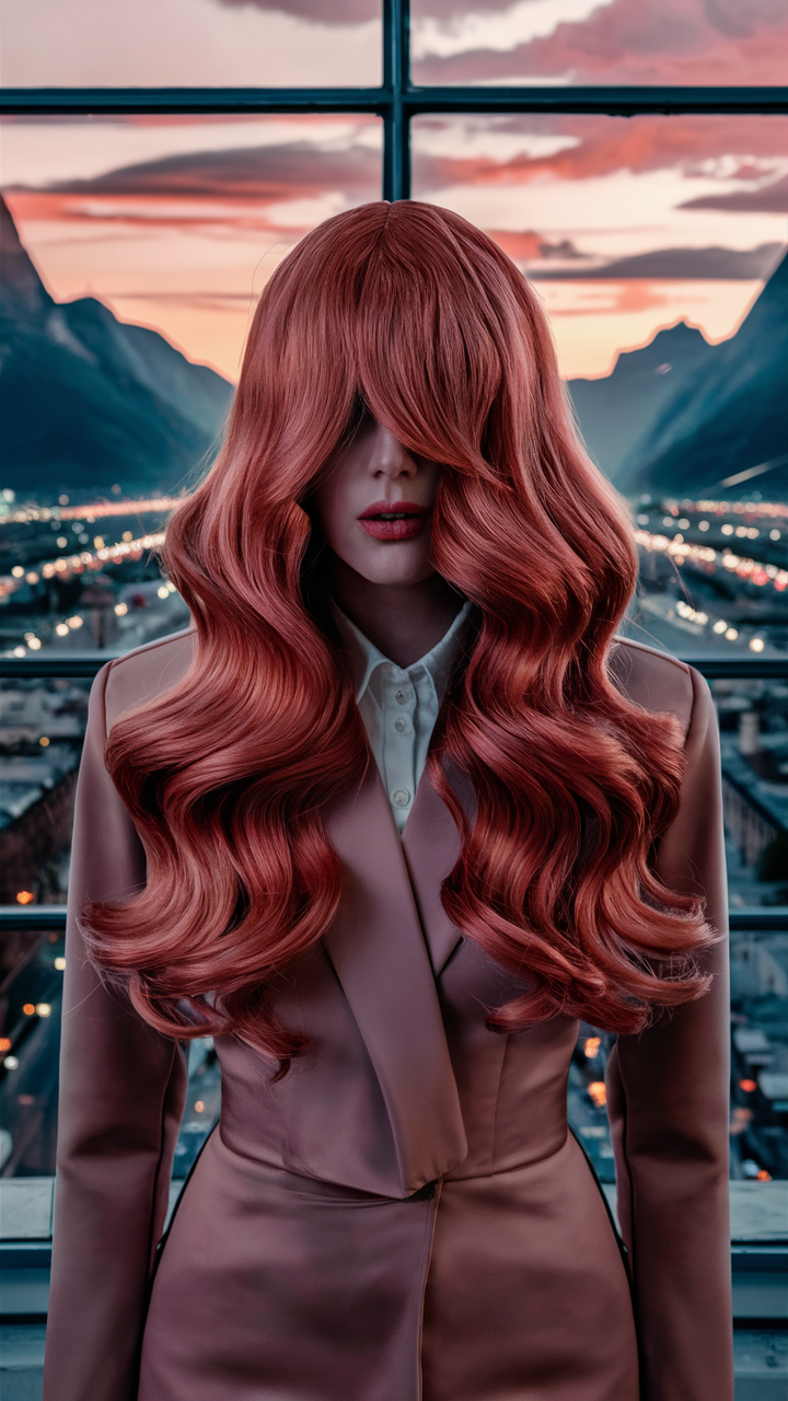 This luxurious long hairstyle showcases bold Cowboy copper hair color 2025 paired with a full, thick fringe. The cascading waves amplify the richness of the copper tones, creating a dramatic, high-impact style. This look is perfect for making a statement at formal events.