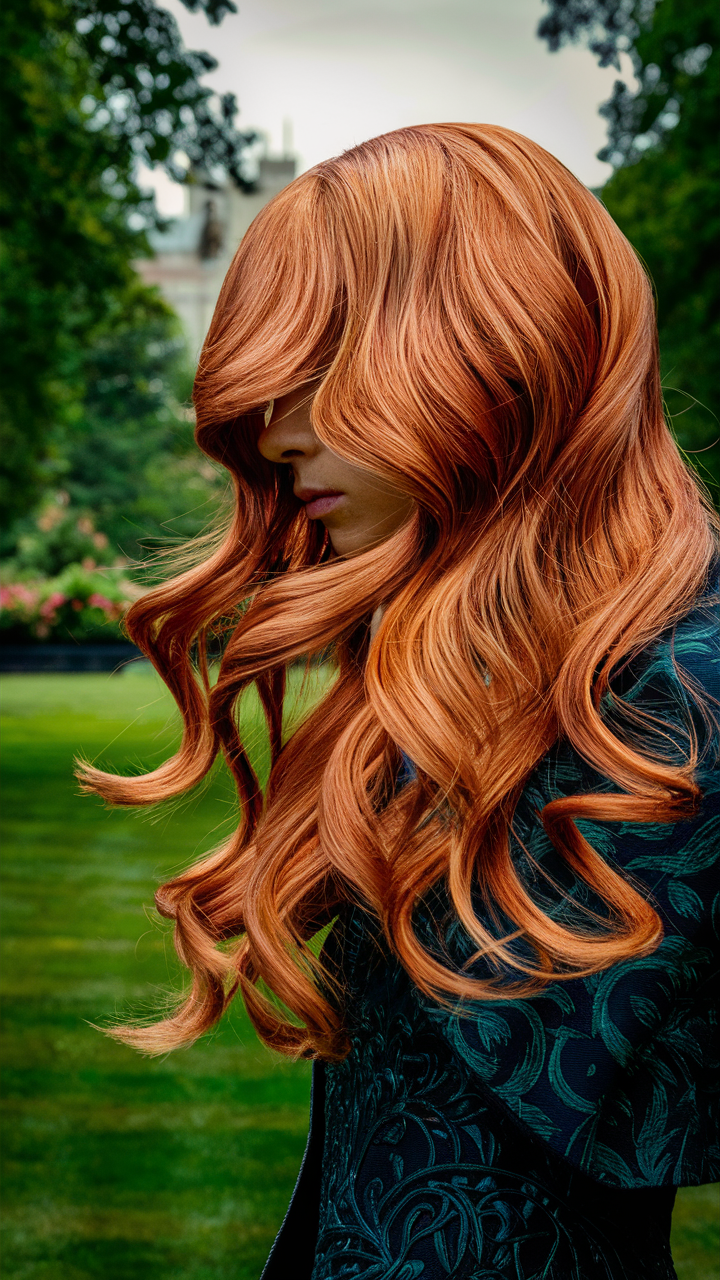 These soft, flowing curls feature vibrant Cowboy copper hair color 2025 with a natural shine and warmth. The rich hues and dynamic texture make it an eye-catching choice for women seeking a bold yet elegant style. It’s a timeless look for both casual and formal settings.