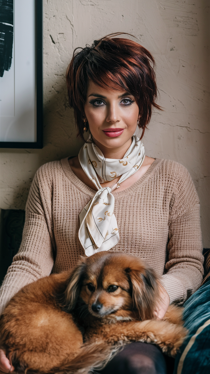 This chic pixie cut features a deep auburn shade that enhances the layers, creating dimension and texture. The wispy bangs frame the face elegantly, making it ideal for highlighting striking facial features. Perfect for a confident and modern look, this haircut is versatile for women seeking effortless maintenance.