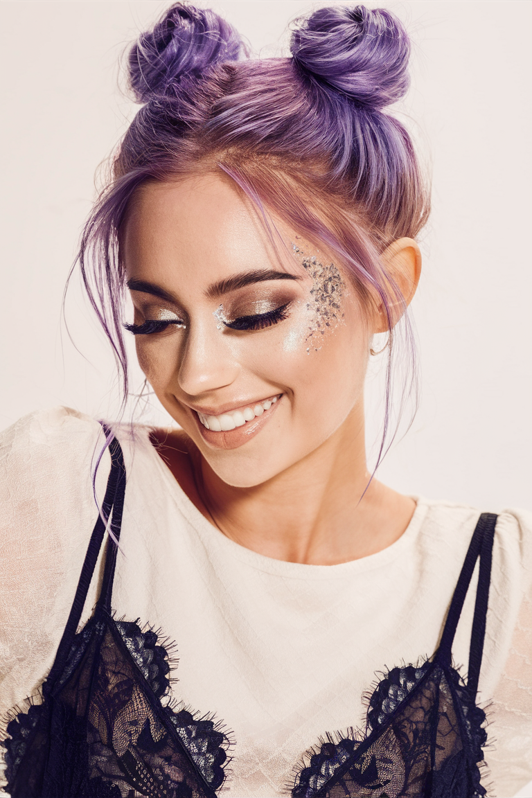 This fun and playful style with space buns is perfect for long and medium-length hair. The purple-tinted hair is twisted into two high buns, giving a cute, trendy look. Glitter makeup adds a whimsical touch, making it ideal for school events or a night out. This style works best for kids or those with thick long hair who want a simple updo that’s full of personality.