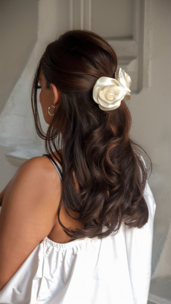 This medium-length hairstyle features a half-up, half-down look adorned with a soft, satin flower. The loose waves create a romantic vibe, making it perfect for special events or a more formal work setting. It’s also a great style for school kids with long curly hair who want something a little extra without much effort.