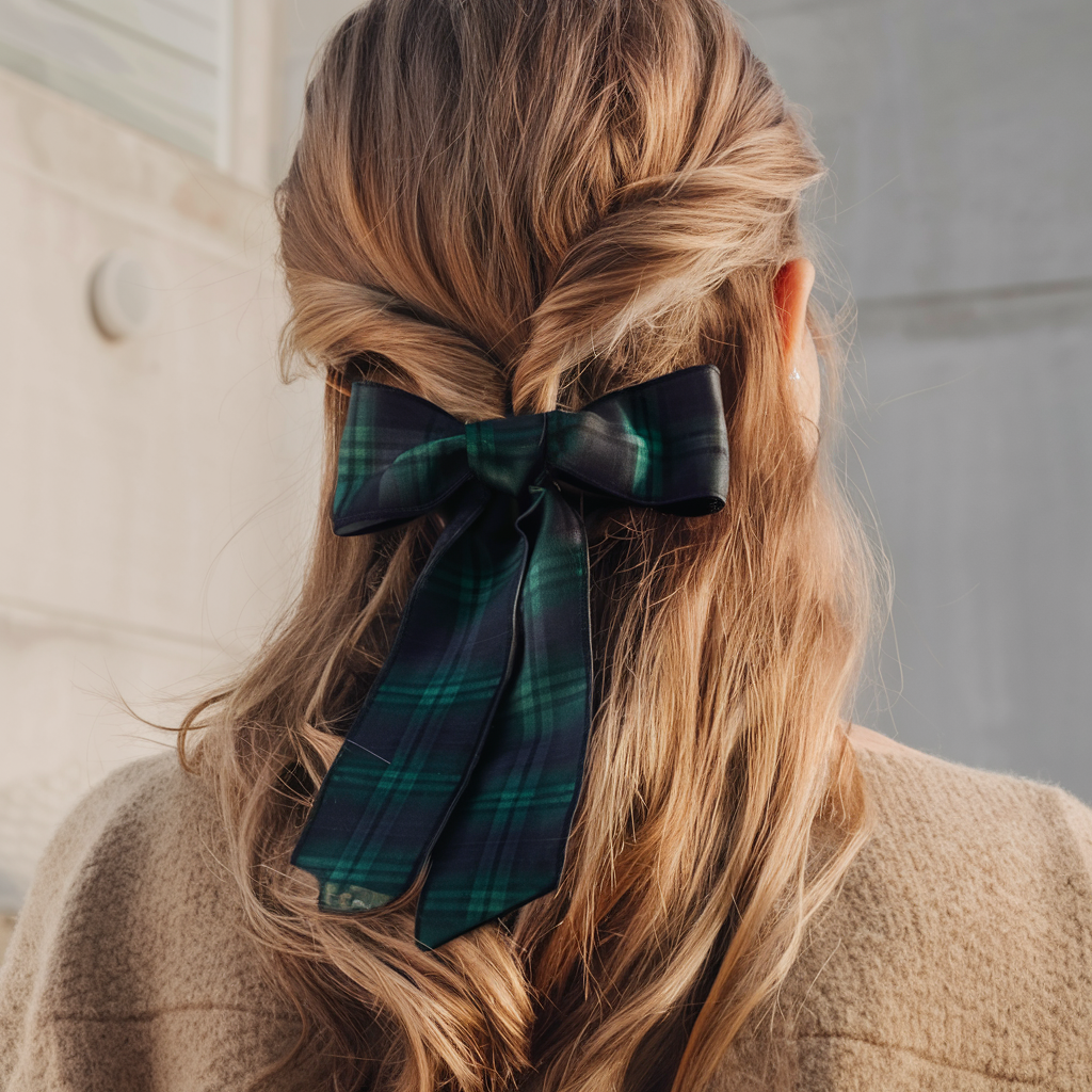 For a whimsical and winter-ready style, this half-up twist paired with a plaid bow is a standout. The twisted strands at the crown add volume, while the plaid bow provides a cozy, seasonal touch. Ideal for school kids or casual winter outings, this hairstyle works perfectly with long hair simple styles and medium hair lengths.