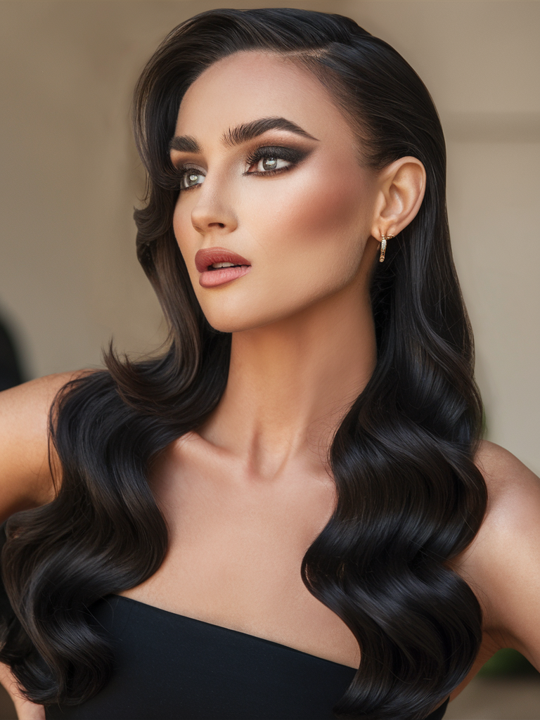 For a timeless, glamorous look, these retro Hollywood waves are a showstopper. The sleek, glossy waves bring an air of sophistication to long hair, making it ideal for formal events. This hairstyle is also versatile for work settings, adding a touch of old Hollywood to your winter look. Perfect for those looking for long hair tutorials with a glamorous edge.