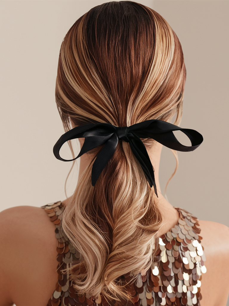 For a more polished approach, this low ponytail tied with a black ribbon exudes elegance and simplicity. Ideal for both work and formal occasions, this style works well with long hair or medium length hair. The soft waves in the ponytail add texture, making this look suitable for both casual and professional settings.