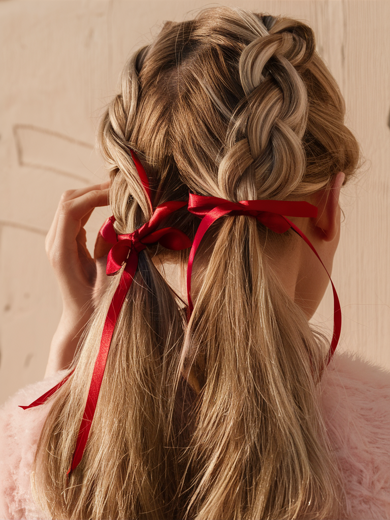 For a playful yet structured style, these Dutch braids tied with red ribbons are perfect for school or casual outings. This look is ideal for kids with long hair or black kids for school. The red ribbons add a festive touch, making it a great hairstyle for the winter season.