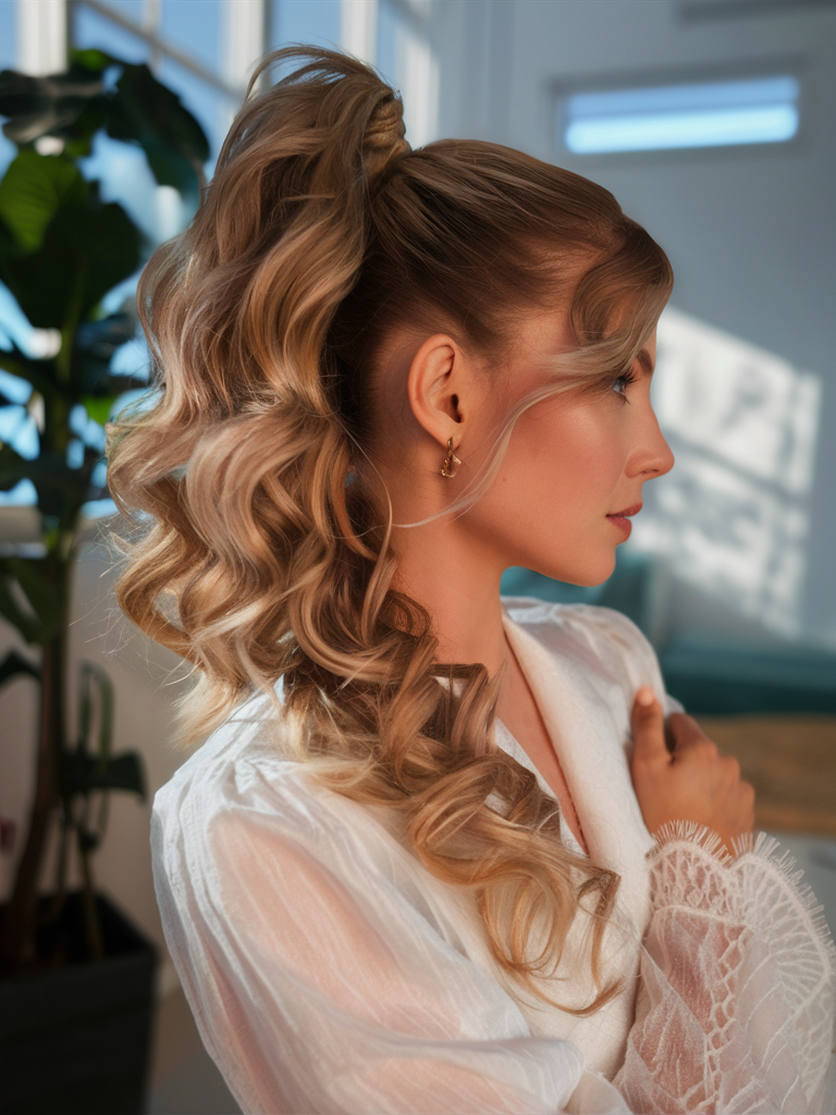 This voluminous, wavy ponytail is perfect for anyone with thick long hair. The added height at the crown gives the look a retro, glamorous feel, making it a great option for a night out or a stylish day at the office. The defined curls add bounce and movement, perfect for those who want an easy yet striking hairstyle for long hair tutorials.