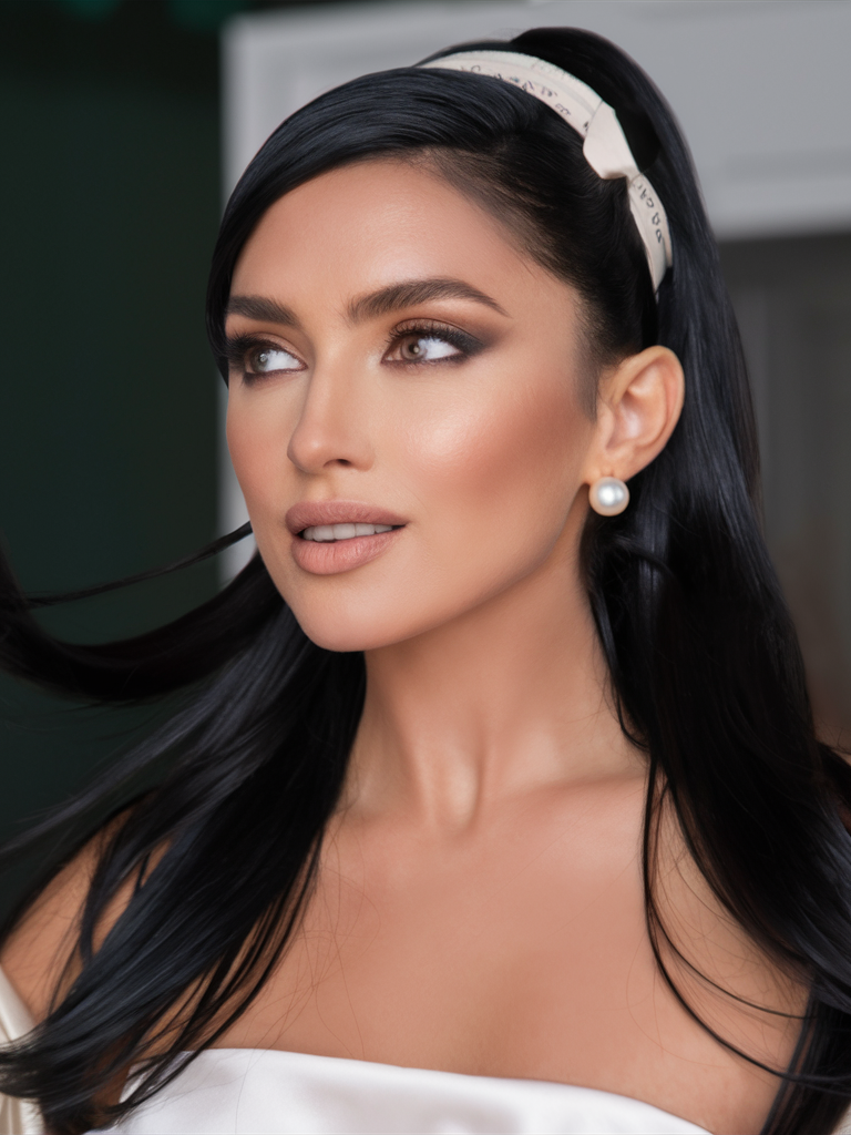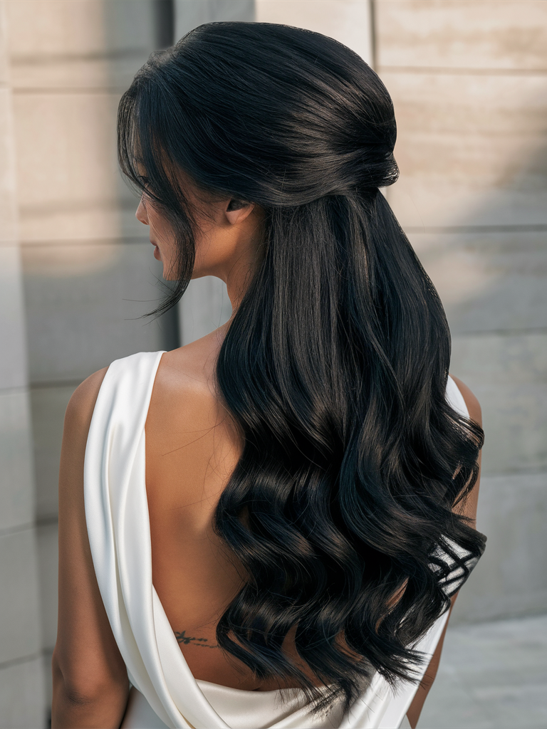 This elegant half-up style features smooth, sleek waves cascading down the back, perfect for a classy winter event or even work. The subtle lift at the crown adds volume, while the soft waves make it suitable for long hair and thick long hair. The glossy finish adds an extra touch of luxury.