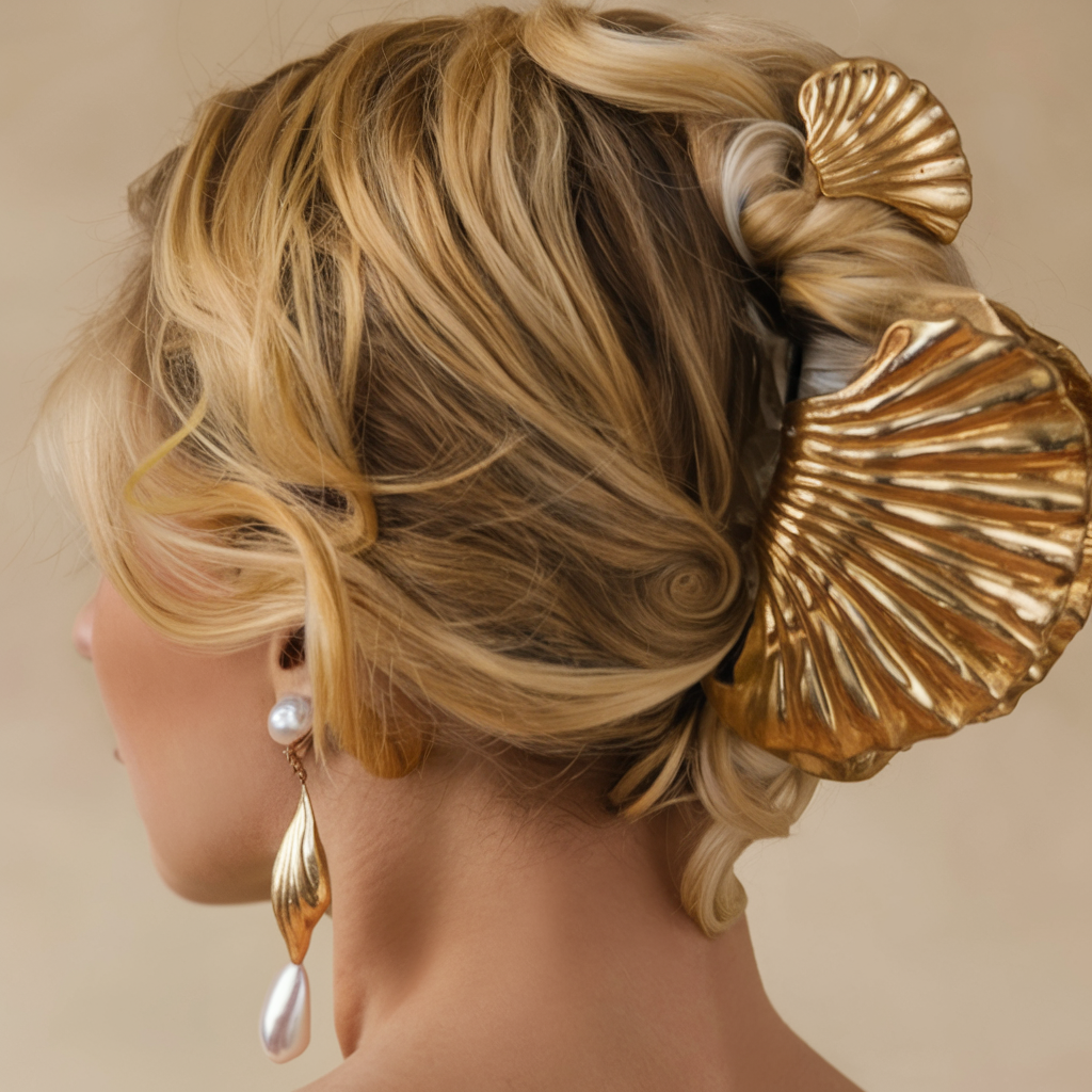 This creative and artistic updo is adorned with large gold seashell accessories, adding a unique twist to a classic messy bun. Perfect for formal occasions or work events where you want to stand out, this style works well with medium length hair or long hair. The accessories bring an element of art and elegance, making it a statement look for winter.