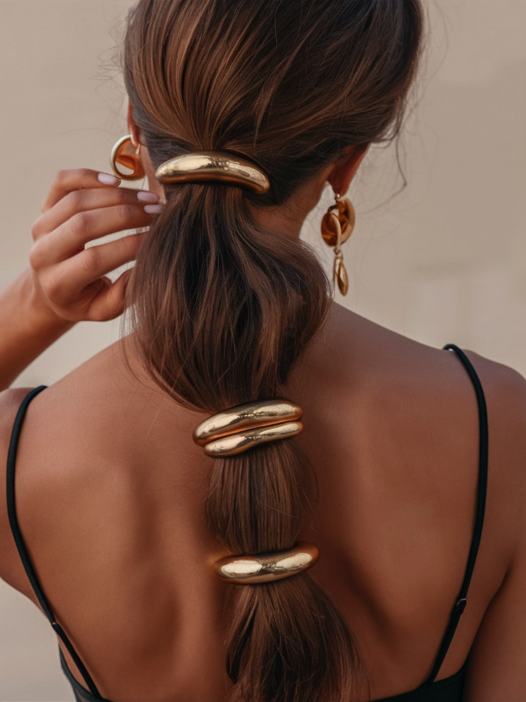 This sleek bubble ponytail is accented with gold hair accessories, offering a chic and trendy winter hairstyle. Great for both school and work, the bubble ponytail creates a structured yet playful look. Ideal for long hair tutorials, this style can be done quickly while still making a bold fashion statement.