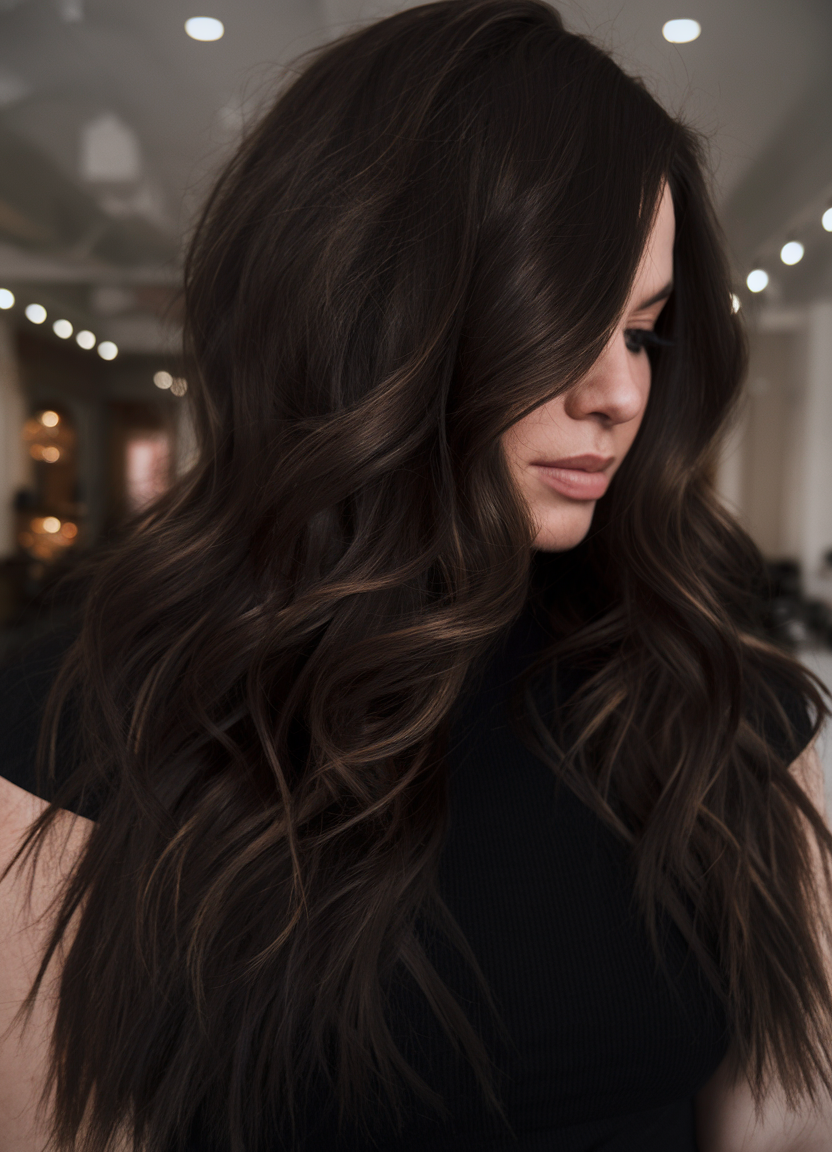 This style features rich dark chocolate waves, softly cascading with subtle highlights. The slight variations in shade provide dimension, while maintaining a deep, dark brunette base. Ideal for brunettes who want to add just a hint of movement and light without compromising on the richness of their natural tone.