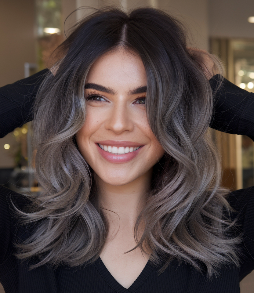 This cool-toned look blends ash brunette with dark roots, creating a fresh and modern winter hairstyle. The soft waves enhance the gradient effect, transitioning from dark at the roots to a silvery-ash tone at the tips. It’s perfect for brunettes wanting to experiment with cooler palette ideas for winter.