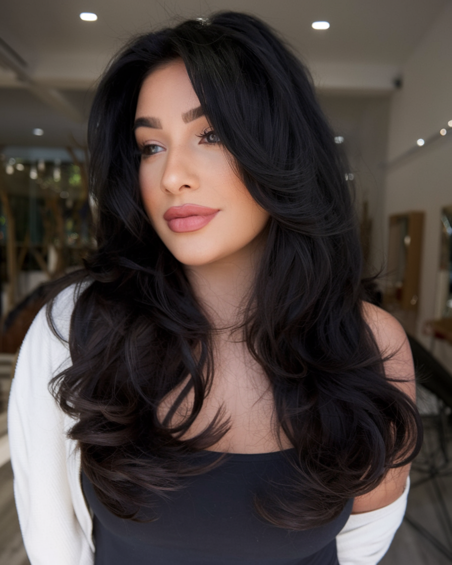 With voluminous black brunette layers, this style is both glamorous and timeless. The deep color emphasizes the fullness and movement of the waves, creating an effortless winter look for those who prefer a dark, sophisticated style. Ideal for brunettes embracing their natural richness.