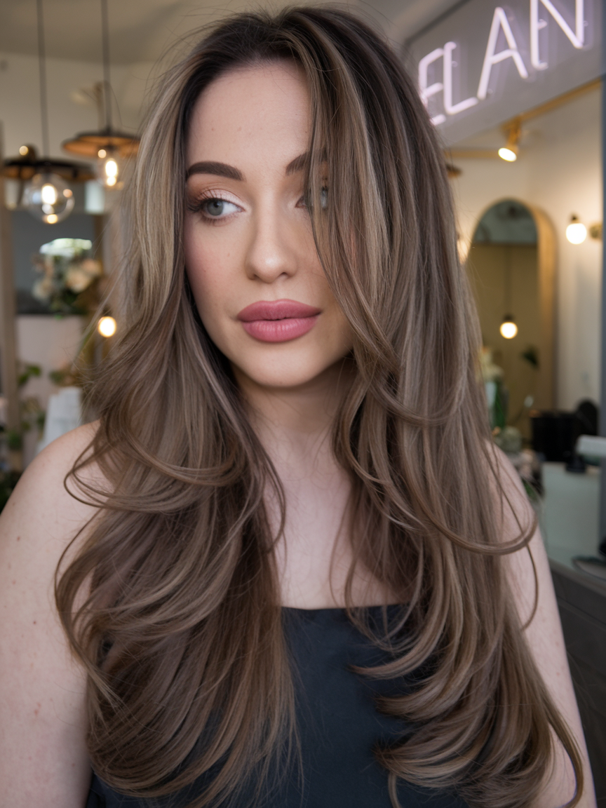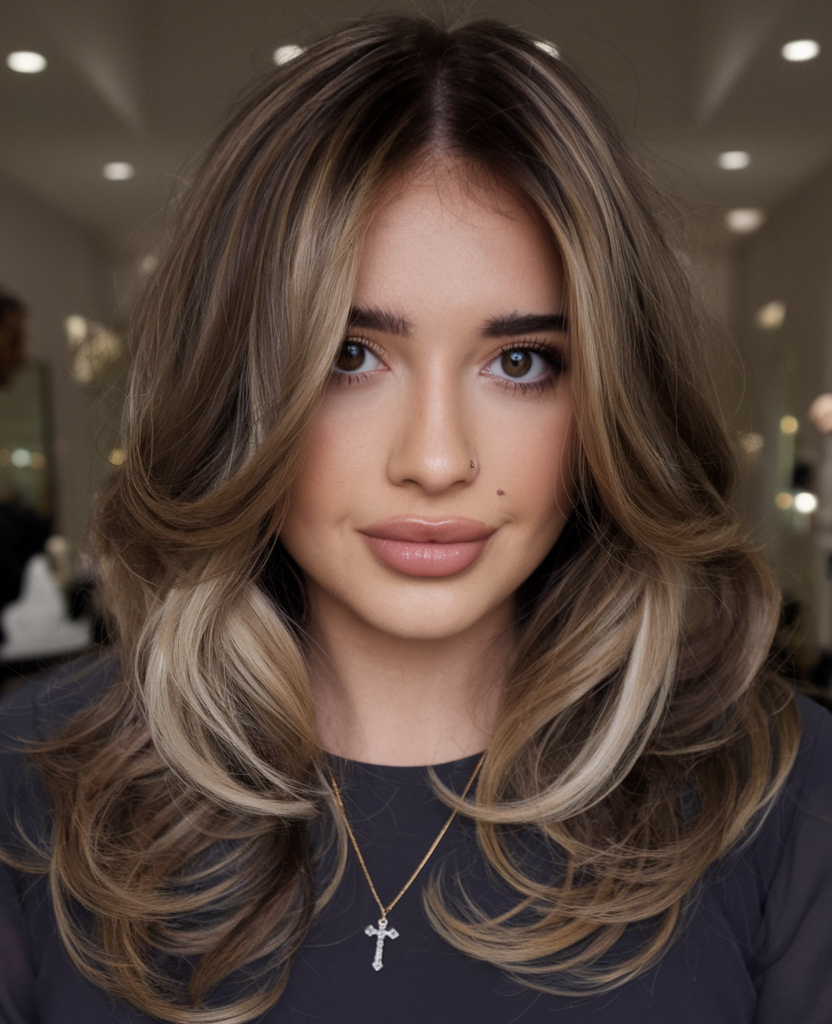 This bold look features a combination of ash blonde and dark brown, creating an eye-catching contrast. The dramatic waves amplify the dimension in the hair, making it an ideal winter hairstyle for those who want to stand out. The ash tones give a cool, sleek finish, adding a modern twist to the classic brown base.