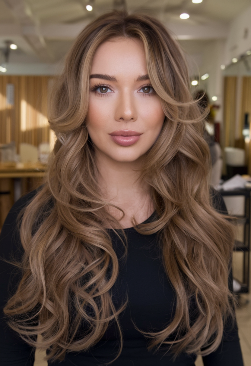 A stunning caramel balayage adds warmth and depth to this brunette base. The face-framing layers and subtle waves highlight the honey tones, offering a natural transition between light and dark. This look is perfect for those seeking a bright, radiant winter look while maintaining the richness of their brunette base.