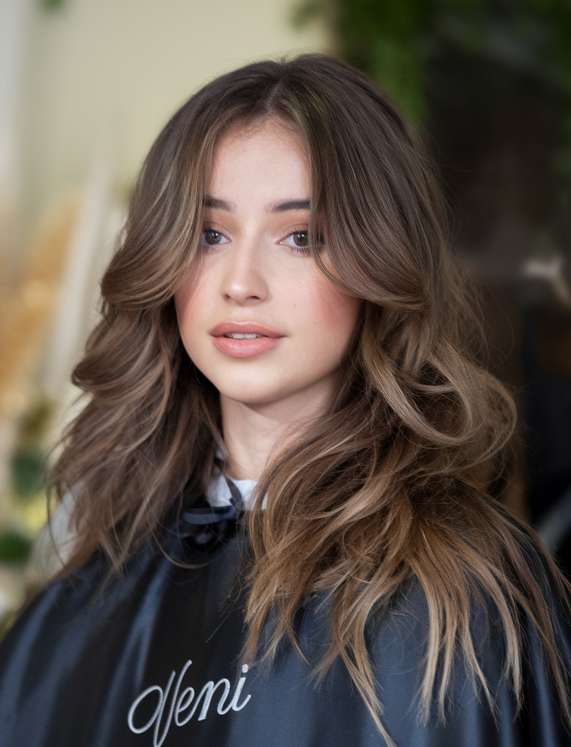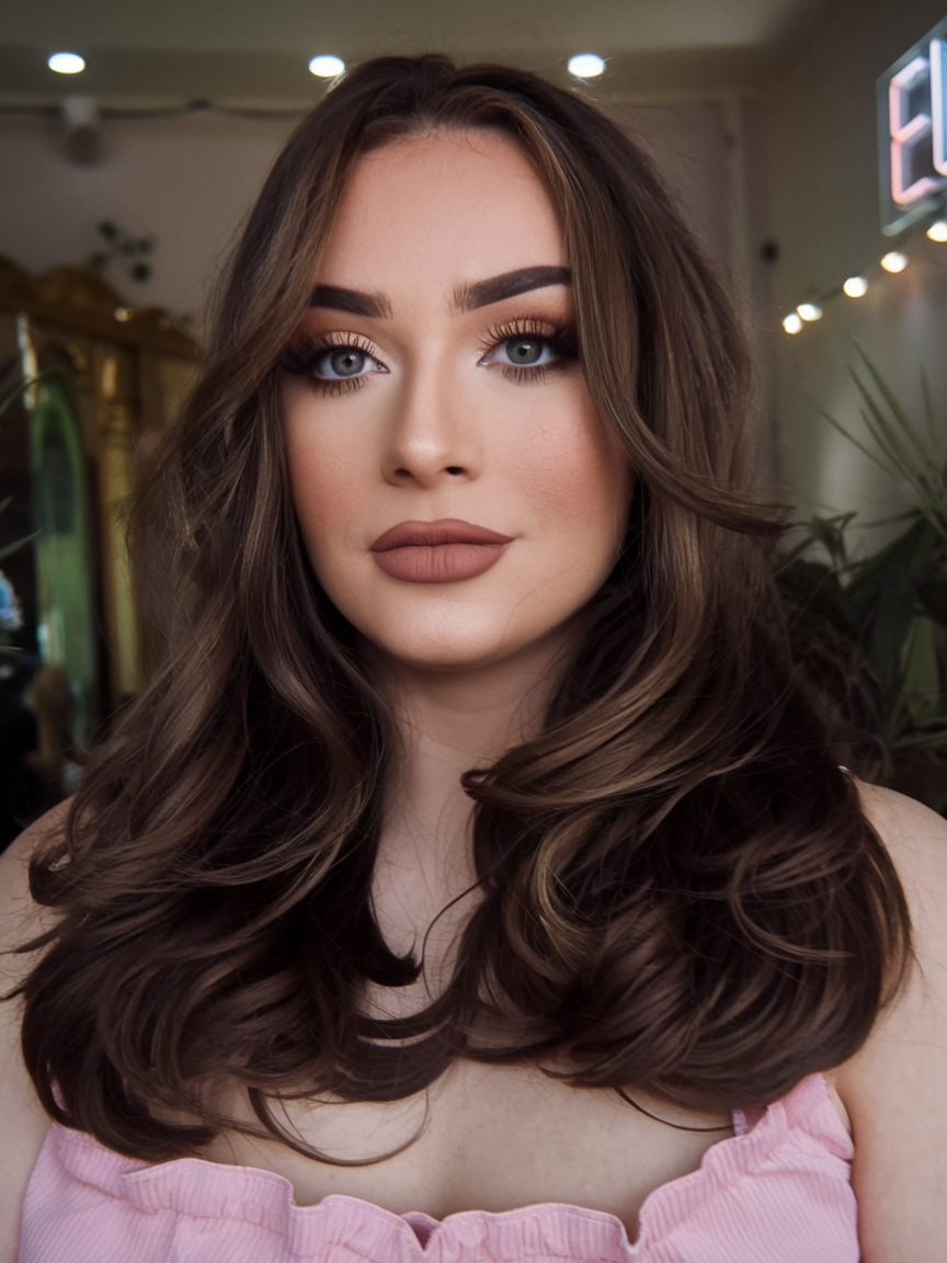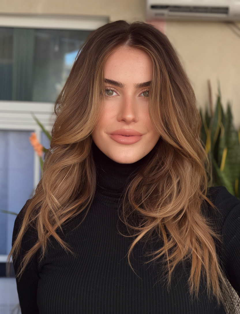 This warm honey brunette look incorporates subtle balayage highlights that add brightness and warmth to the hair. The soft waves and face-framing highlights create a sun-kissed effect, perfect for those who want to keep a natural brunette base with added lightness for winter.