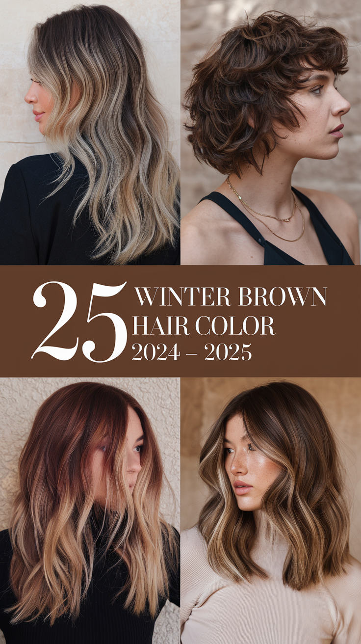 This look blends mushroom brown tones with soft blonde highlights, creating a balanced and subtle winter hairstyle. The long layers give the hair extra movement, while the delicate highlights brighten the face, offering a natural glow. Perfect for brunettes seeking a lightened look without fully committing to blonde.