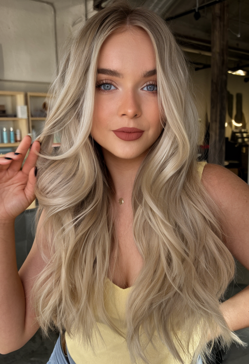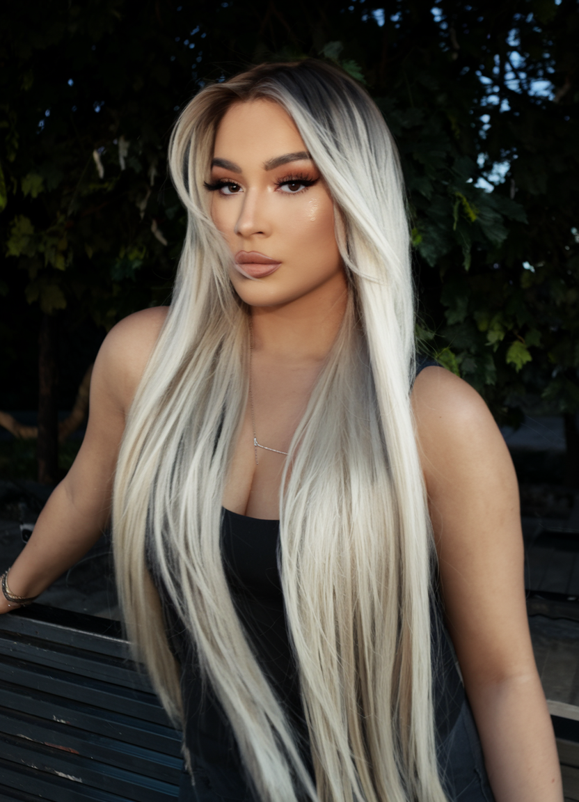 This icy blonde ombre offers a sleek transition from dark roots to platinum ends, creating a high-contrast look perfect for winter. The long, flowing locks complement the cool tones of the season, adding elegance and depth to the style. Ideal for those looking to make a bold statement while keeping it chic and polished.