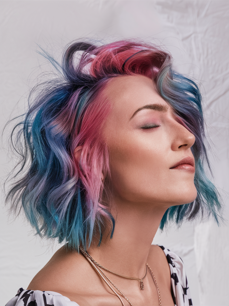 This cotton candy-inspired blend of pink and blue creates a whimsical, colorful look perfect for winter. The soft pastels work well on short, wavy hair, adding a playful yet trendy element to the style. It’s a fun way to brighten up your look during the colder months and stands out as a unique color choice.