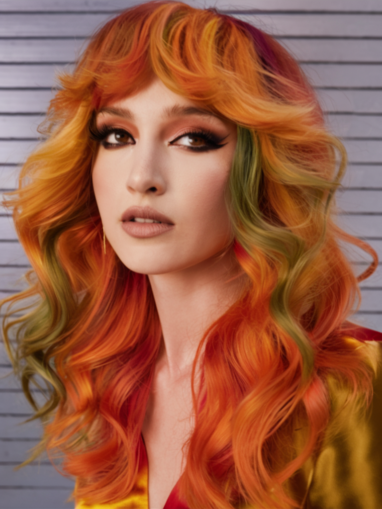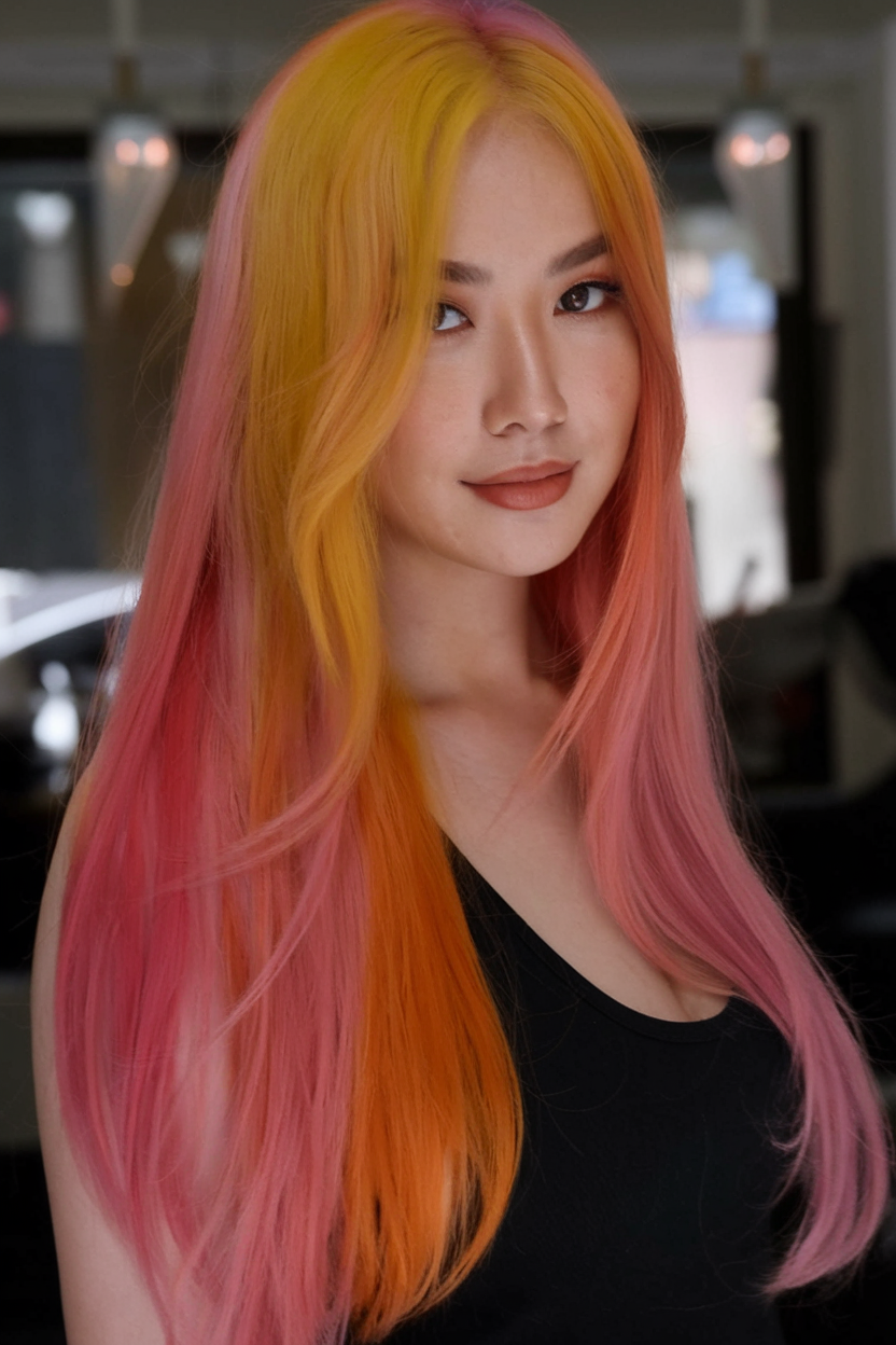 A daring mix of yellow, orange, and pink hues creates this striking pastel blend. This bold color combination is ideal for long, straight hair, adding vibrancy and fun to your winter style. The smooth transition between shades brings out a playful yet sophisticated look, making it a top choice for those looking to stand out.