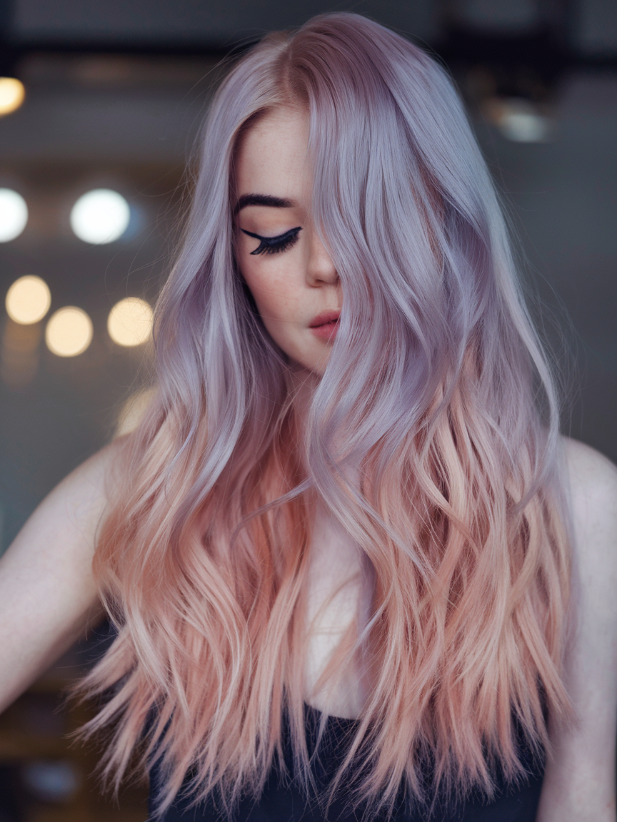 This stunning combination of frosted lavender and peach offers a modern, chic look for winter. The pastel shades melt together to create a soft, ethereal effect that adds depth and texture to long, wavy hair. The icy lavender tones are perfect for the season, while the peach adds a touch of warmth.