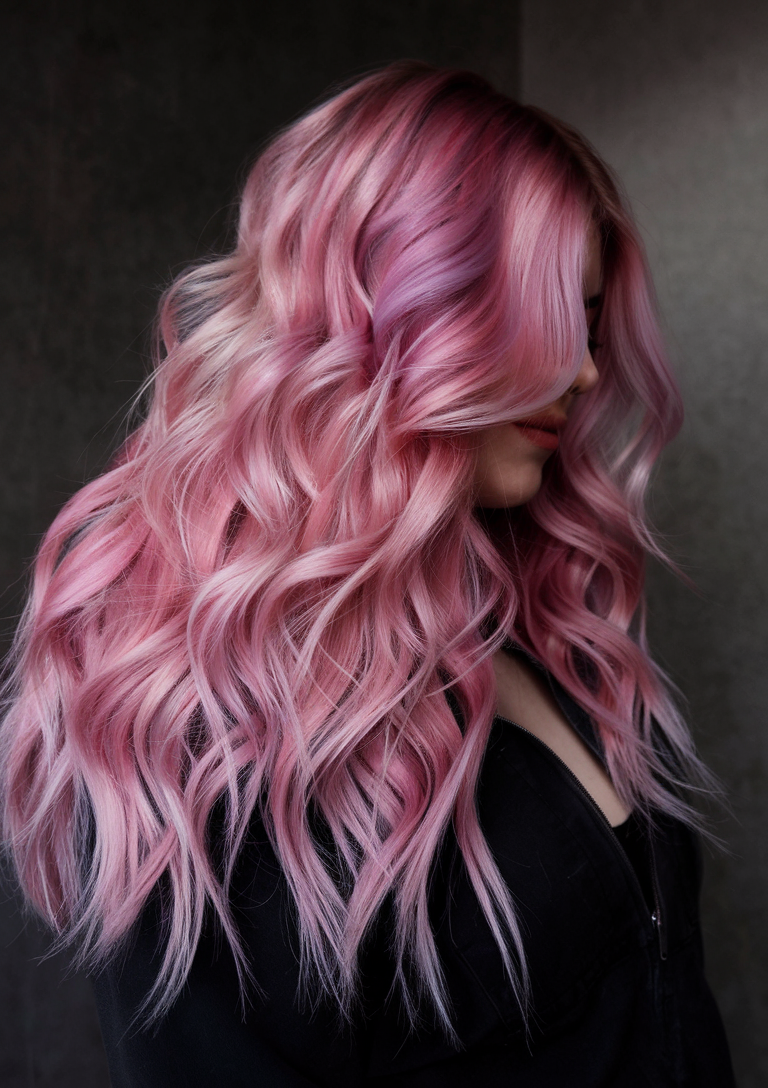 This soft pastel pink is a dreamy, feminine look that feels effortlessly romantic. The hair is styled in loose, voluminous waves, creating a fairytale-like aesthetic. The blend of light and medium pink tones brings depth and dimension, adding a soft glow to the overall appearance. The waves fall naturally, giving the hair a lot of movement while maintaining that delicate and soft texture. It’s the perfect choice for anyone wanting to embrace a playful yet sophisticated pink shade.