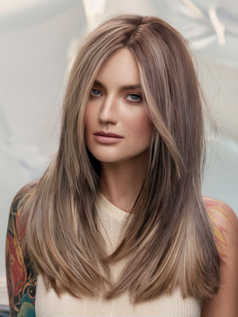 A gorgeous blend of ash blonde and subtle highlights gives this look a dimensional and modern finish. The sleek, straight layers are carefully cut to create a sharp yet soft silhouette. The natural transition between darker roots and lighter ends adds a sense of depth, making this hairstyle ideal for those wanting a low-maintenance yet stylish look. This color combination works well for anyone who loves a neutral tone that still feels fresh and on-trend.
