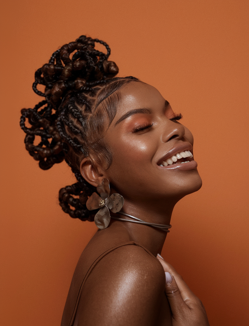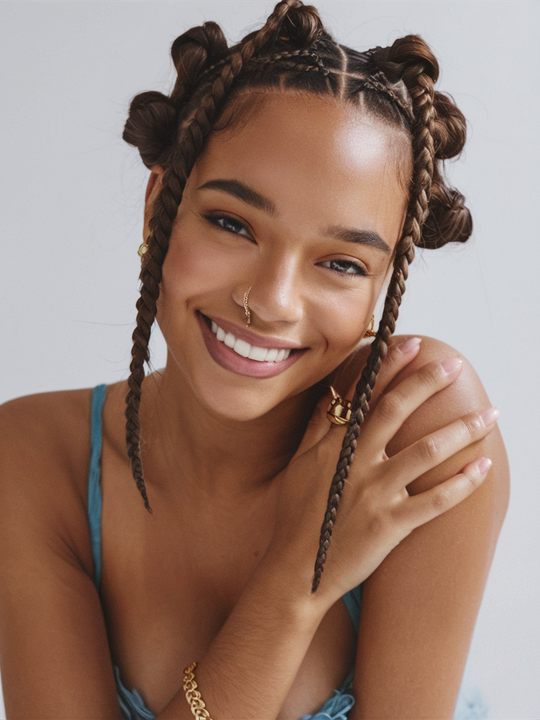 Double Bantu knots with braided sections are a playful, youthful look that combines natural hair with African-inspired elements. This hairstyle works well for those who love types of braided looks while maintaining a cute, protective style. Pair it with minimal accessories to let the braids and knots take center stage.