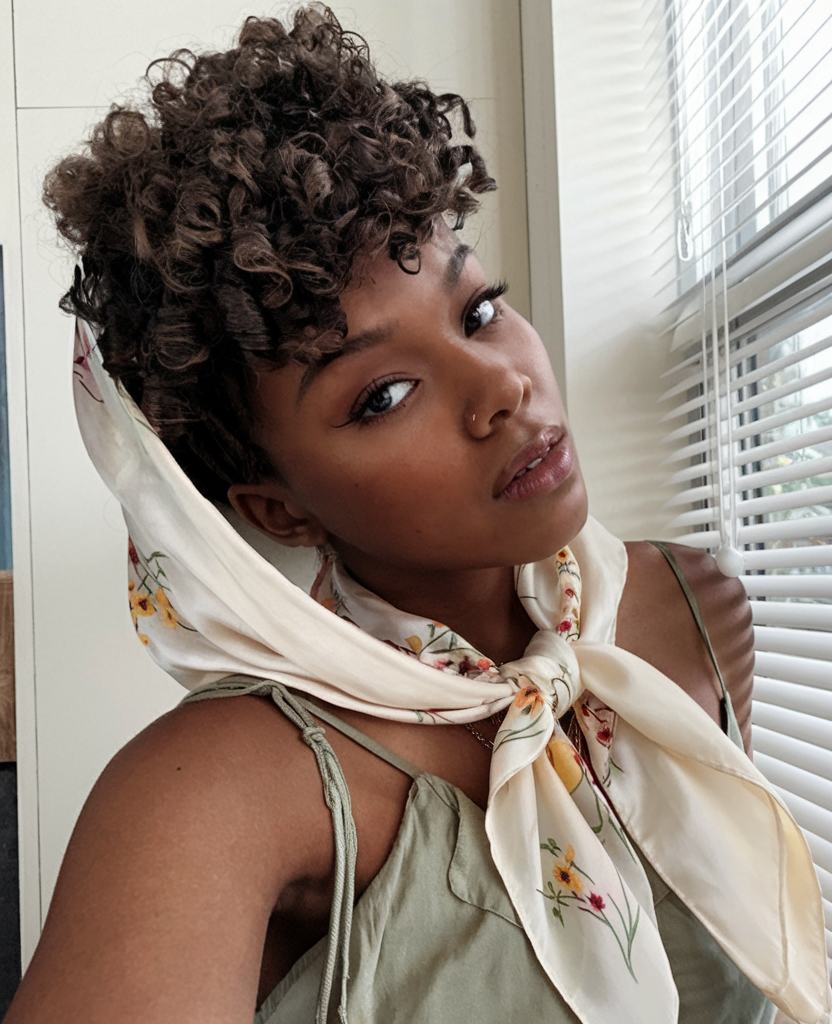 This short mohawk combines tight curls with a playful scarf, perfect for women looking for a casual yet chic style. The scarf adds a soft, feminine touch to the voluminous curls, making it ideal for winter outings. It’s a great protective style for natural short hair, and the scarf can be swapped out to match any outfit.