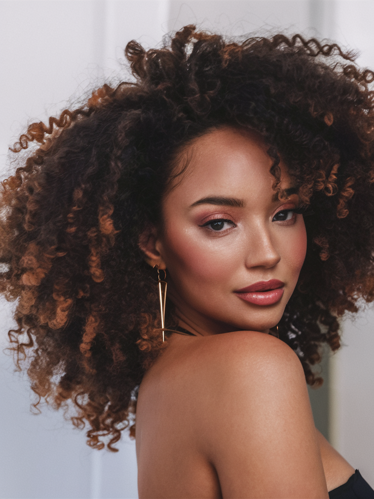 These voluminous, defined curls feature a warm ombre effect, with hints of caramel running through the ends. The texture and natural volume make this look perfect for those with sassy short or medium-length hair. Use a curl-enhancing cream to maintain the bounce and definition throughout the day, ideal for showcasing a natural winter hairstyle.