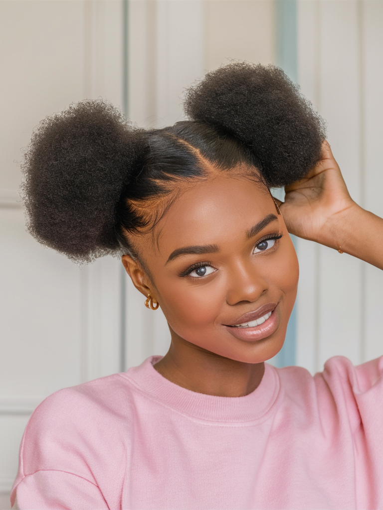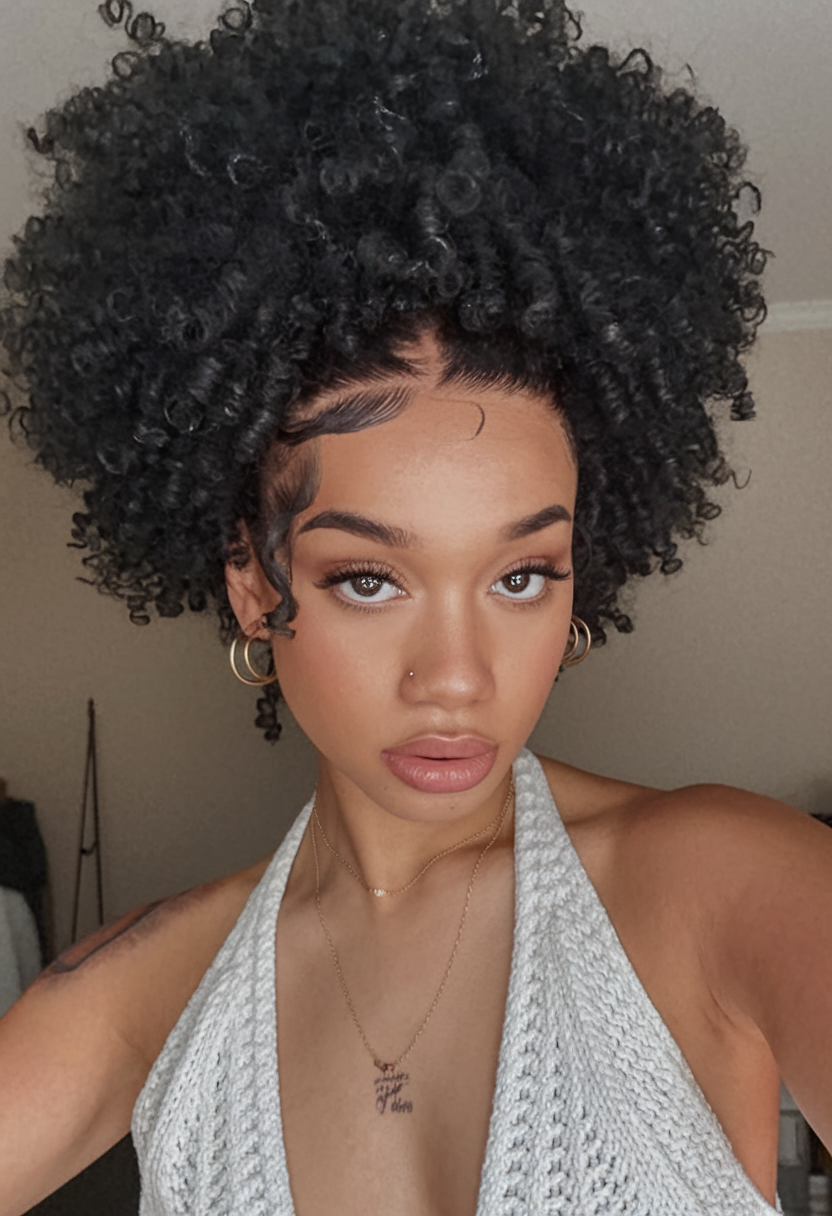 This bold natural afro puff highlights defined, coiled strands with sleek baby hairs framing the face. The combination of volume and intricate edges gives it a vampire allure, making it a go-to for women wanting a fierce yet elegant winter style. Keeping the edges in place with edge control gel will maintain the sharp look throughout the day.